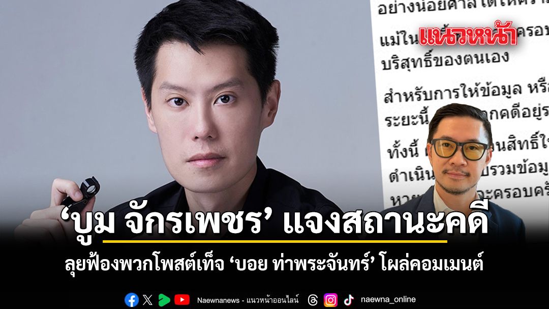 ล่าสุดวานนี้ 24 มีนาคม 2569 กลายเป็นประเด็นที่สังคมออนไลน์กำลังให้ความสนใจอย่างใกล้ชิด สำหรับกรณีของ บูม จักรเพชร ที่ล่าสุดเจ้าตัวได้ออกมาโพสต์ข้อความผ่านเฟซบุ๊กส่วนตัว ชี้แจงถึงสถานการณ์คดีความที่กำลังเป็นข้อถกเถียงในขณะนี้ โดยระบุข้อความว่า "อย่างน้อยศาลได้ให้ความเป็นธรรมในเบื้องต้นแก่ผมแล้ว แม้ในวันนี้ ผม และ ครอบครัว จะได้รับผลกระทบจากเหตุการณ์ดังกล่าว แต่ผมขอเดินหน้าต่อไปเพื่อพิสูจน์ความบริสุทธิ์ของตนเอง สำหรับการให้ข้อมูล หรือ แสดงความคิดเห็นใด ๆ ที่อาจกระทบต่อคู่กรณี ผมขอสงวนการเปิดเผยข้อเท็จจริงในระยะนี้ เนื่องจากคดีอยู่ระหว่างการพิจารณา และเพื่อความเหมาะสมต่อกระบวนการยุติธรรม ทั้งนี้ ผมขอสงวนสิทธิ์ในการปกป้องตนเอง ครอบครัว อาชีพ และธุรกิจ โดยขณะนี้ได้มอบหมายให้ทนายความดำเนินการรวบรวมข้อมูลเกี่ยวกับบุคคลผู้มีพฤติการณ์ด่าทอหรือเผยแพร่ข้อความอันเป็นเท็จ ซึ่งก่อให้เกิดความเสียหายแก่ผมและครอบครัว"