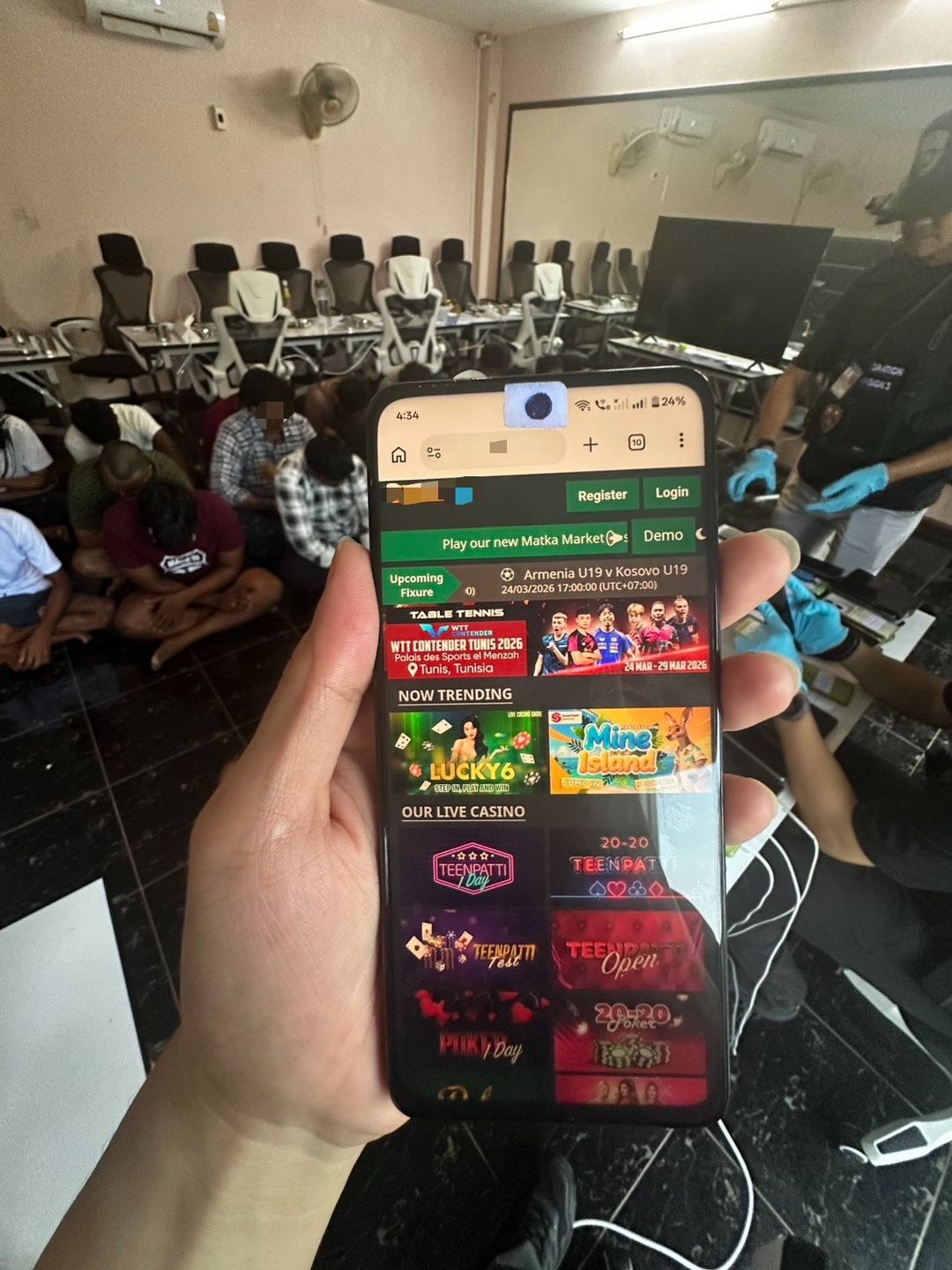 จากการตรวจสอบเบื้องต้นพบหลักฐานความเชื่อมโยงกับระบบพนันที่มีเงินหมุนเวียนเฉลี่ย 5.6 ล้านรูปีต่อวัน (หรือประมาณ 700 ล้านบาทต่อปี) เจ้าหน้าที่จึงได้ตรวจยึดของกลาง ได้แก่ อุปกรณ์คอมพิวเตอร์โน้ตบุ๊กและโทรศัพท์มือถือรวมกว่า 80 รายการ โดยหนังสือเดินทางของผู้ต้องหาซึ่งทั้งหมดถือวีซ่าประเภทท่องเที่ยว (Tourist Visa)