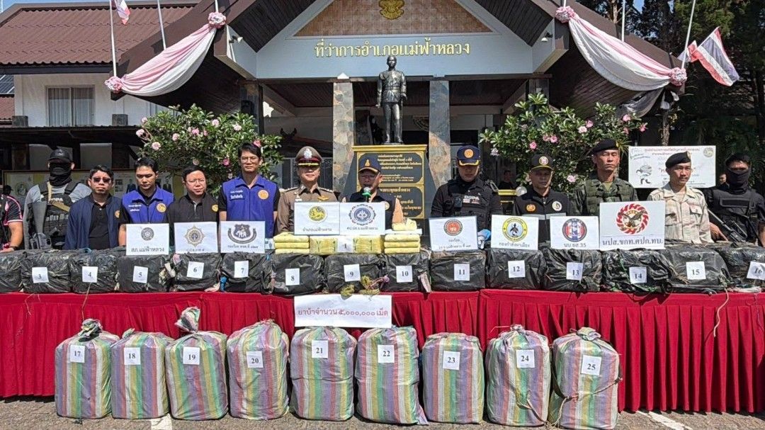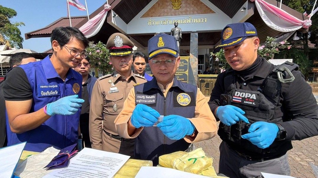 วันที่ 25 มี.ค. 69 ที่ลานเอนกประสงค์ หน้าที่ว่าการอำเภอแม่ฟ้าหลวง นายประเสริฐ จิตต์พลีชีพ รองผู้ว่าราชการจังหวัดเชียงราย พร้อมด้วยตัวแทนจากกองกำลังผาเมือง ตำรวจภูธรจังหวัดเชียงราย และฝ่ายปกครอง ร่วมกันแถลงผลการตรวจยึดยาเสพติดรายสำคัญภายใต้มาตรการเข้มงวดช่วงก่อนเทศกาลสงกรานต์