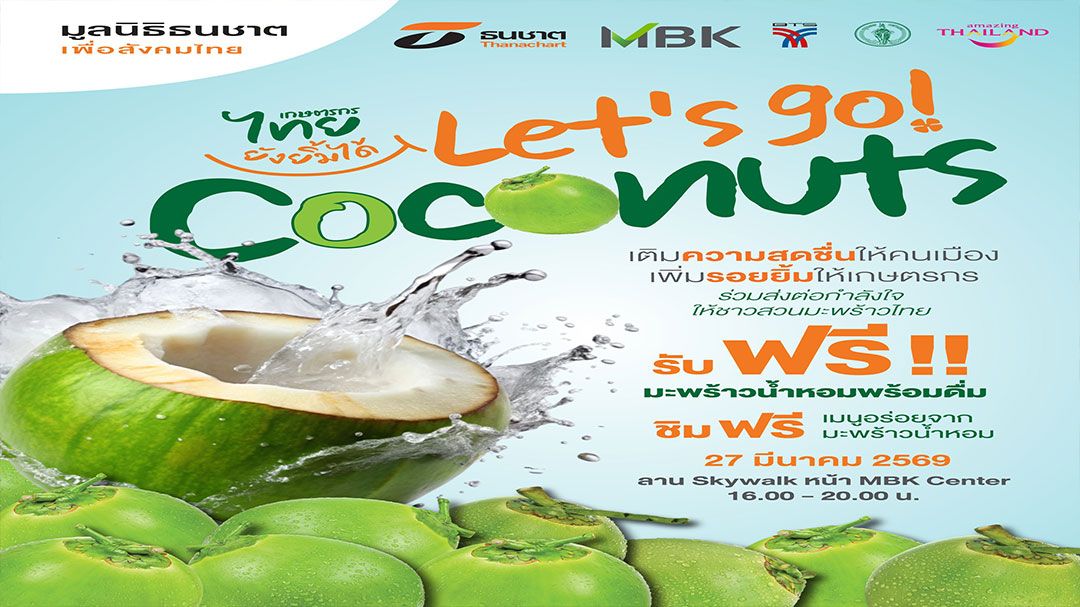 วันที่ 26 มี.ค.69 มูลนิธิธนชาตเพื่อสังคมไทย ร่วมกับ กลุ่มธนชาต บริษัท เอ็ม บี เค จำกัด (มหาชน) พร้อมด้วย กรุงเทพมหานครโดยนายศานนท์ หวังสร้างบุญ รองผู้ว่าราชการกรุงเทพมหานคร การท่องเที่ยวแห่งประเทศไทย และ บริษัท ระบบขนส่งมวลชนกรุงเทพ จำกัด (มหาชน) (BTS) กำหนดจัดกิจกรรม “เกษตรกรไทยยังยิ้มได้ : Let’s go! Coconuts” เพื่อช่วยบรรเทาความเดือดร้อนของเกษตรกรผู้ปลูกมะพร้าวน้ำหอมที่กำลังได้รับผลกระทบจากภาวะราคาผลผลิตตกต่ำ โดยมีเป้าหมายเพื่อช่วยระบายผลผลิต สร้างรายได้ และส่งต่อกำลังใจให้เกษตรกรสามารถดำรงอาชีพได้อย่างมั่นคง ขึ้นในวันศุกร์ที่ 27 มีนาคม 2569 ตั้งแต่เวลา 16.00 น. เป็นต้นไป ณ ลานสกายวอล์ค ชั้น 2 ศูนย์การค้าเอ็ม บี เค เซ็นเตอร์ โดยภายในงานมีกิจกรรมหลากหลายเพื่อเปิดโอกาสให้ประชาชนและนักท่องเที่ยวร่วมเป็นส่วนหนึ่งในการสนับสนุนเกษตรกรไทย และสร้างการรับรู้ถึงคุณค่าของผลผลิตจากเกษตรกรไทย ดังนี้ แจกฟรี! มะพร้าวน้ำหอมแท้จากสวน ส่งตรงจากมือเกษตรกรจำนวนกว่า 10,000 ลูก เพื่อช่วยบรรเทาปัญหาผลผลิตล้นตลาดและสร้างรายได้กลับคืนสู่เกษตรกรโดยตรง