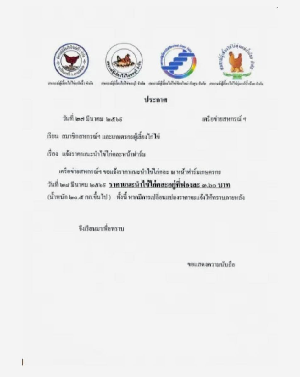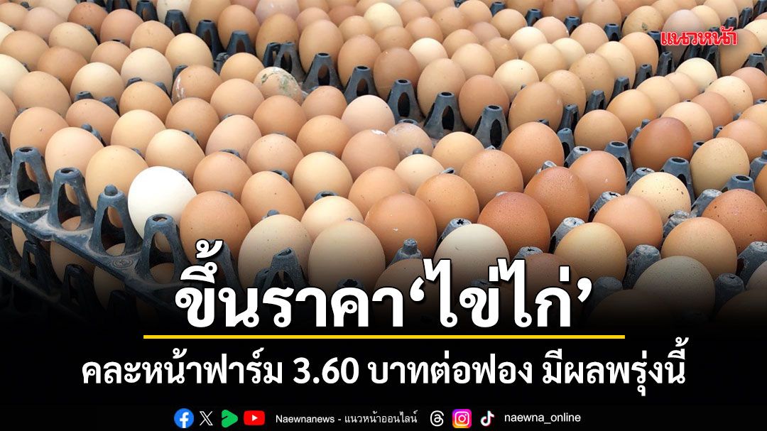 "เครือข่ายสหกรณ์ผู้เลี้ยงไก่ไข่"ออกประกาศปรับขึ้นราคา"ไข่ไก่หน้าฟาร์ม"เป็น 3.60 บาทต่อฟอง ในวันพรุ่งนี้
