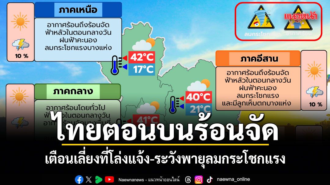 29 มีนาคม 2569 พยากรณ์อากาศประจำวัน ลักษณะอากาศทั่วไป พยากรณ์อากาศ 24 ชั่วโมงข้างหน้า ประเทศไทยมีอากาศร้อนโดยทั่วไป กับมีฟ้าหลัวในตอนกลางวัน และมีอากาศร้อนจัดบางพื้นที่ในภาคเหนือ ภาคตะวันออกเฉียงเหนือ และภาคกลาง โดยมีฝนฟ้าคะนองกับมีลมกระโชกแรงบางแห่ง เนื่องจากความกดอากาศต่ำเนื่องจากความร้อนปกคลุมประเทศไทยตอนบน ในขณะที่ลมใต้และลมตะวันออกเฉียงใต้ที่พัดปกคลุมบริเวณดังกล่าวมีกำลังแรงขึ้น ขอให้ประชาชนบริเวณประเทศไทยดูแลรักษาสุขภาพเนื่องจากสภาพอากาศที่ร้อนถึงร้อนจัด โดยหลีกเลี่ยงการทำงานหรือการประกอบกิจกรรมในที่โล่งแจ้งเป็นระยะเวลานาน รวมทั้งระวังอันตรายจากฝนฟ้าคะนองและลมกระโชกแรงที่อาจเกิดขึ้นในบางพื้นที่ไว้ด้วย