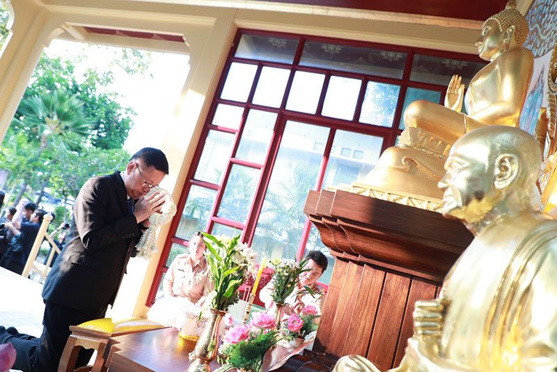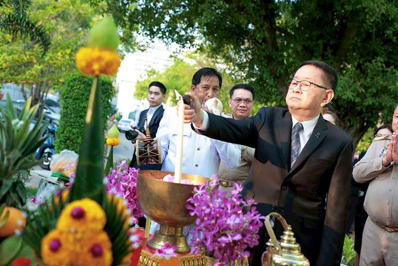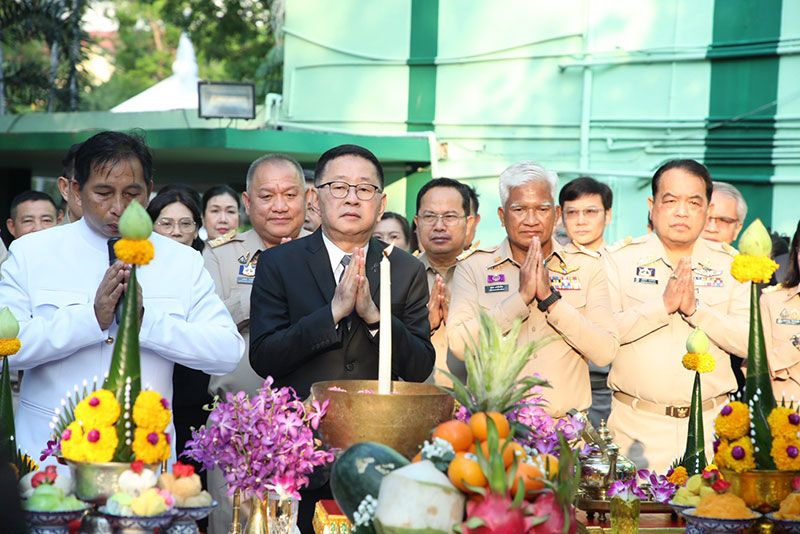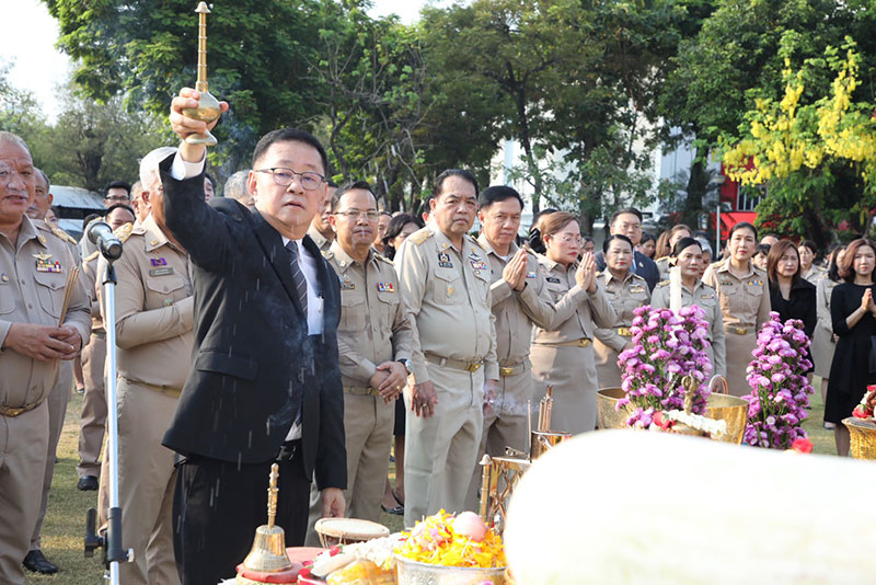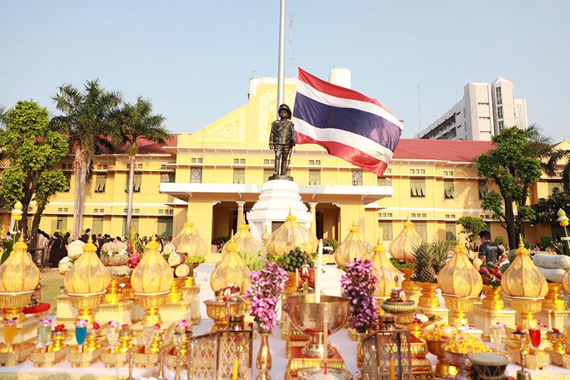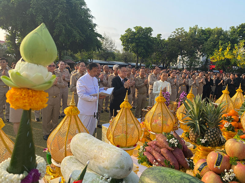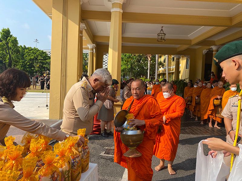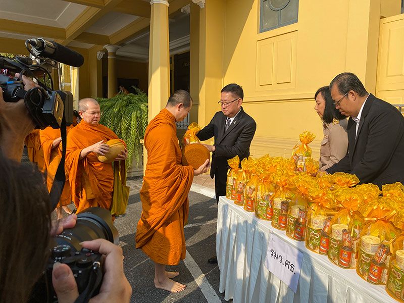 ต่อจากนั้น ประธานพิธี พร้อมด้วยคณะผู้บริหาร และบุคลากร ร่วมตักบาตรพระสงฆ์และสามเณร จำนวน 135 รูป บริเวณหน้าอาคารราชวัลลภ เป็นอันเสร็จพิธี