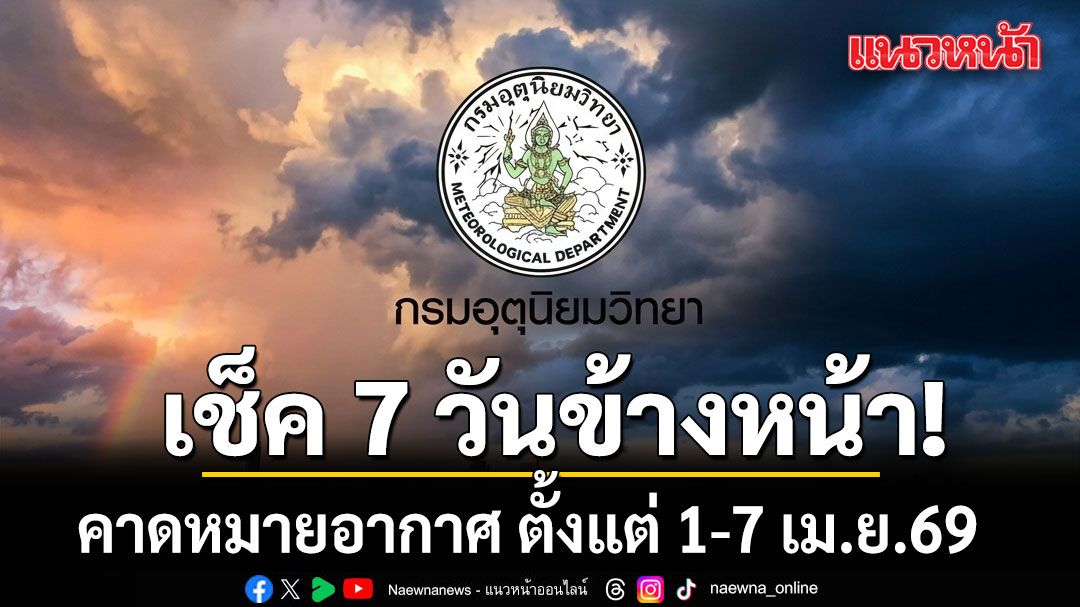 เมื่อเวลา 12.00 น. วันที่ 1 เมษายน 2569 กรมอุตุนิยมวิทยา คาดหมายอากาศทั่วไป พยากรณ์อากาศ 7 วันข้างหน้า ระหว่างวันที่ 1 - 7 เมษายน พ.ศ. 2569 ดังนี้