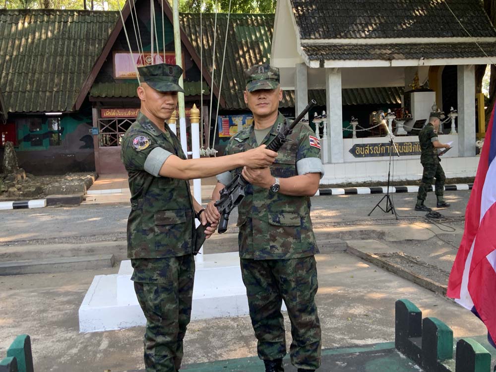 จากนั้นเวลา 15.00 น.วันเดียวกัน น.อ.ธรรมนูญ วรรณา ได้ทำพีธีมอบตำแหน่งให้กับน.อ.ปรัชญา โพธิย้อย ผู้บังคับหน่วยเฉพาะกิจนาวิกโยธิตราดคนใหม่ โดยการมอบปืนให้ และได้กล่าวกับกำลังพลในสังกัด ประกอบด้วย ชุดควบคุมทหารพรานนาวิกโยธินที่ 1 และ ที่ 3 หน่วยเฉพาะกิจนาวิกโยธินที่ 182 หาดเล็ก กองร้อยตำรวจตะเวนชายแดนที่ 117 กองพันทหารนาวิกโยธิน ที่มารับมอบตำแหน่ง น.อ.ธรรมนูญ กล่าวสั้นๆด้วยน้ำเสียงสั่นเครือว่า ตลอดระยะเวลา 6 เดือน ที่ผ่านมาสิ่งที่จะอยู่ในความทรงจำของผมตลอดไป คือการได้รับความร่วมมือ ร่วมใจ จากทุกท่านเป็นอย่างดี ในการปฏิบัติหน้าที่ราชการ เพื่อรักษาอธิปไตย และสร้างความสงบสุข เรียบร้อยให้เกิดแก่ประชาชนในพื้นที่รับผิดชอบจนเป็นที่ยอมรับของผู้บังคับบัญชา และประชาชนในพื้นที่มาโดยตลอด โดยเฉพาะวันแรกที่มาได้กล่าวว่า หากเราพร้อมเขาจะไม่พร้อมกับเรา และเราได้พิสูจน์ให้เห็นแล้วว่าเป็นจริง และที่กล่าวไว้ว่า ปัญกาเก่าเราจะแก้ไข และปัญหาใหม่จะไม่เกิดขึ้น ซึ่งเราก็ได้ทำได้แล้ว และสิ่งที่สำคัญที่สุดก็คือการได้พื้นที่บ้าน 3 หลังกลับคืนมา ซึ่งเป็นเพราะทุกคน ทุกหน่วยได้ช่วยเหลือกัน จึงขอให้ทุกคนจงมีความภาคภูมิใจ ในการปฏิบัติหน้าที่ และขอขอบคุณทุกคน