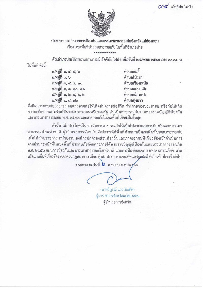 เมื่อวันที่ 3 เมษายน 2569 เวลา 00.01 น.กองอำนวยการป้องกันและบรรเทาสาธารณภัยจังหวัดแม่ฮ่องสอน ได้ประกาศให้พื้นที่ 2 อำเภอในจังหวัดแม่ฮ่องสอน เป็นเขตพื้นที่ประสบสาธารณภัย ได้แก่ อำเภอปาย และ อำเภอแม่สะเรียง ซึ่งมีผลกระทบต่อสาธารณชนและอาจก่อให้เกิดอันตรายต่อชีวิต ร่างกายของประชาชน หรือก่อก่อให้เกิดความเสียหายแก่ทรัพย์สินของประชาชนหรือของรัฐ อันเป็นสาธารณภัยตามพระราชบัญญัติป้องกันและบรรเทาสาธารณภัย พ.ศ.2550 และสาธารณภัยในเขตพื้นที่ ภัยยังไม่สิ้นสุดดังนั้น เพื่อประโยชน์ในการจัดการสาธารณภัยให้เป็นไปตามแผนการป้องกันและบรรเทาสาธารณภัยแห่งชาติ ผู้อำนวยการจังหวัด จึงประกาศให้พื้นที่ ดังกล่าวเป็นเขตขึ้นที่ ประสบสาธาธารณภัยเพื่อให้ส่วนราชการ หน่วยงาน องค์กรปกครองส่วนท้องถิ่นและภาคเอกชนที่เกี่ยวข้องเข้าดำเนินการตามอำนาจหน้าที่ในเขตพื้นที่ประสบภัยดังกล่าวภายใต้พระราชบัญญัติป้องกันและบรรเทาสาธารณภัยพ.ศ.2550 แผนการป้องกันและบรรเทาสาธารณภัยแห่งชาติ แผนการป้องกันและบรรเทาสาธาธารณภัยจังหวัดหรือแผนอื่นที่เกี่ยวข้อง ตลอดจนกฎหมาย ระเบียบ คำสั่ง ประกาศ และมติคณะรัฐมนนตรี ที่เกี่ยวข้องโดยเร็วต่อไป