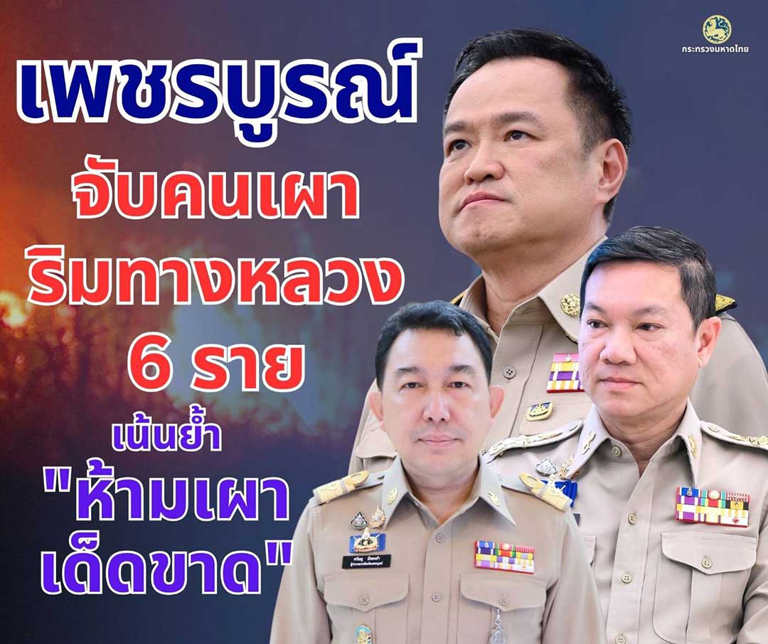 ปลัดกระทรวงมหาดไทย กล่าวว่า ในช่วงสายวันนี้ ตนได้รับรายงานจากนายศรัณยู มีทองคำ ผู้ว่าราชการจังหวัดเพชรบูรณ์ ถึงการดำเนินการจับกุมผู้กระทำความผิดกรณีเผาหญ้าและวัสดุทางการเกษตรริมทางหลวงพื้นที่อำเภอวิเชียรบุรี จังหวัดเพชรบูรณ์ โดยการลาดตระเวนของฝ่ายปกครอง นำโดย ปลัดอำเภอฝ่ายความมั่นคง สมาชิกกองอาสารักษาดินแดน กำนัน ผู้ใหญ่บ้าน ผู้ช่วยผู้ใหญ่บ้าน สารวัตรกำนัน ซึ่งเป็นการดำเนินการให้เป็นไปตามประกาศจังหวัดเพชรบูรณ์ เรื่องมาตรการป้องกันไฟป่าและหมอกควัน ที่มีผลใช้บังคับถึงวันที่ 30 เมษายน 2569 นี้