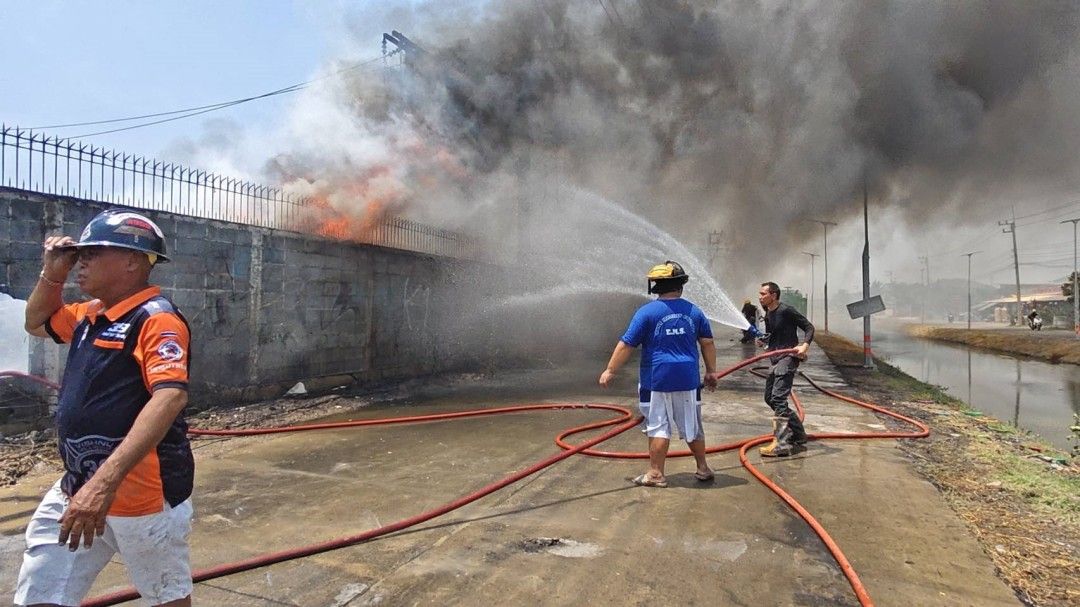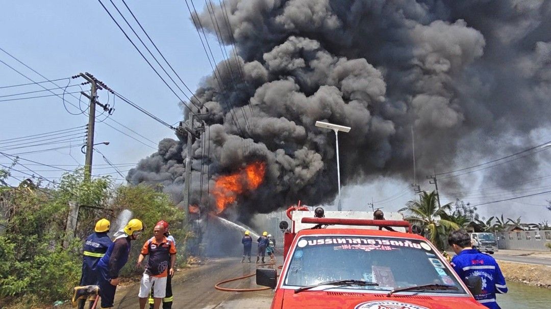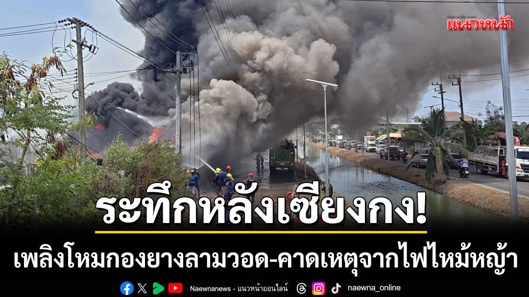 เพลิงไหม้กองยางหลังเซียงกงรังสิต! ลามวอดรถยนต์ 2 คัน กู้ภัยระดมทุบกำแพงสกัดไฟ คาดต้นเพลิงมาจากไฟไหม้หญ้า