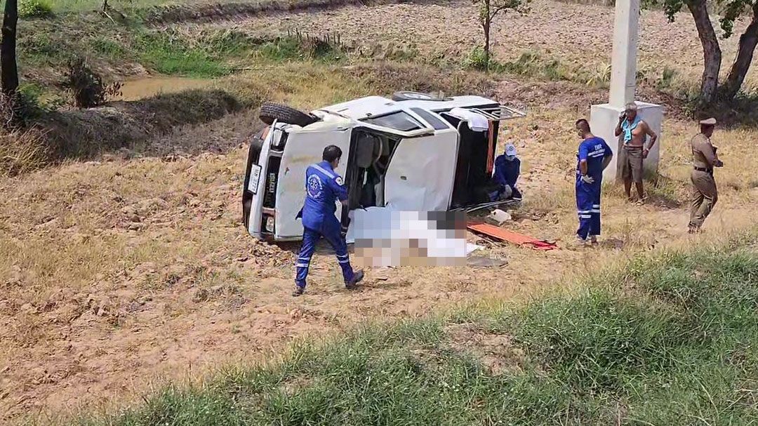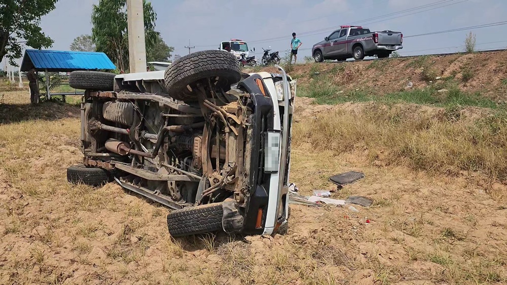 สองเฒ่าควบกระบะเยี่ยมหลานแรกเกิดที่ศรีสะเกษ รถคว่ำตกข้างทาง ดับ 1 เจ็บ 1