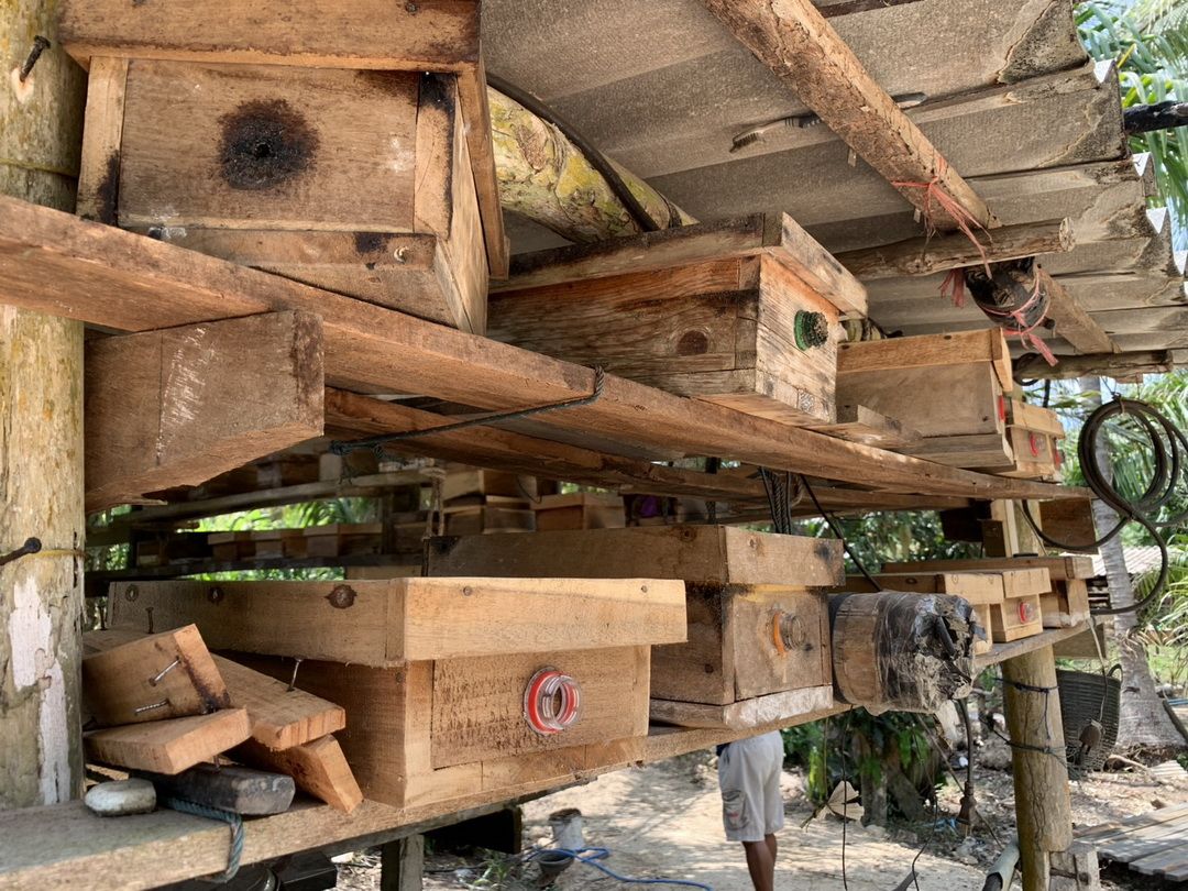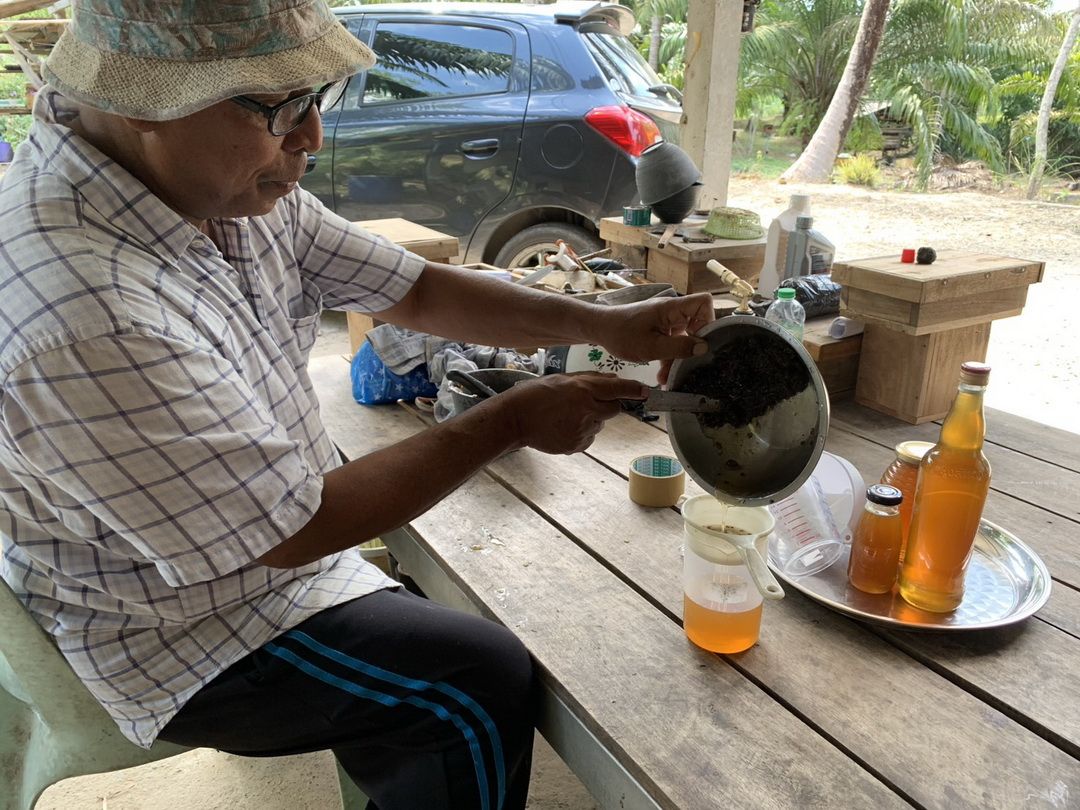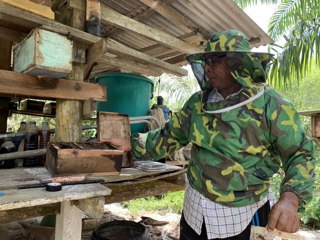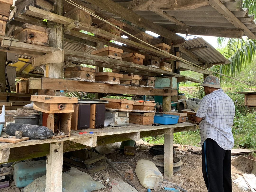 วันที่ 6 เม.ย. 69 ผู้สื่อข่าวรายงานว่า ณ หมู่ที่ 3 ต.บางเป้า อ.กันตัง จ.ตรัง นายอับดลรักหีม อวนข้อง เกษตรกรวัย 59 ปี ประสบความสำเร็จในการใช้พื้นที่ว่างรอบบ้านเลี้ยง ‘ผึ้งจิ๋ว’ หรือ ‘ชันโรง’ (ภาษาใต้เรียก ‘อุง’) พันธุ์ขนเงิน เพื่อเก็บน้ำผึ้งคุณภาพสูงจำหน่าย โดยเฉพาะในช่วงเดือนมีนาคม-เมษายน ซึ่งเป็นช่วงหน้าแล้งที่น้ำผึ้งมีความเข้มข้นสูงสุด หรือที่เรียกว่า ‘น้ำผึ้งเดือน 5’