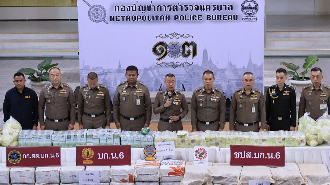 รองผบ.ตร.ในฐานะผอ.ศอ.ปส.ตร.พร้อมผบช.น.ร่วมแถลงข่าวจับยาเสพติดบิ๊กลอต‘ยาไอซ์-เคตามีน’รวมกว่า1.6 ตัน อำพรางแอบซุกในรถกระบะขนผัก พบเป็นเครือข่ายยาเสพติดประเทศเพื่อนบ้าน เตรียมขยายผลหาผู้ร่วมกระบวนการ รวมถึงระดับสั่งการมาดำเนินคดี