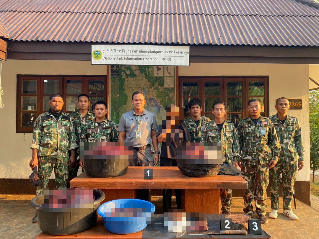 วันที่ 7 เม.ย. 69 นายยุทธพงค์ ดำศรีสุข หัวหน้าอุทยานแห่งชาติทองผาภูมิ เปิดเผยผลการจับกุมขบวนการลักลอบค้าซากสัตว์ป่าคุ้มครอง โดยเมื่อเวลา 11.30 น. ของวันที่ 6 เมษายนที่ผ่านมา ได้รับแจ้งเบาะแสว่ามีการนำสัตว์ป่ามาจำหน่ายที่ร้านขายของชำแห่งหนึ่งในหมู่ 5 ต.ห้วยเขย่ง อ.ทองผาภูมิ จ.กาญจนบุรี จึงสั่งการให้ชุดสายตรวจปราบปรามส่วนกลาง อุทยานฯทองผาภูมิ สนธิกำลังร่วมกับ ตชด.135, ทหารฉก.ลาดหญ้า และตำรวจ สภ.ทองผาภูมิ เข้าตรวจสอบทันที