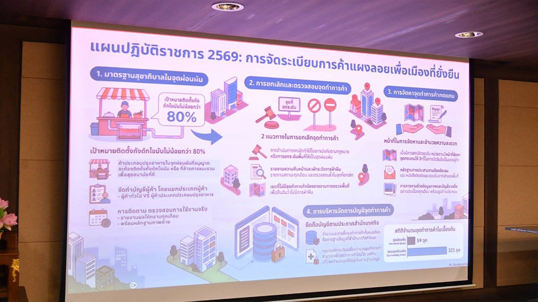 ในที่ประชุมได้รายงานการจัดระเบียบพื้นที่ทำการค้าของกรุงเทพมหานคร ประจำปี พ.ศ. 2569 โดยมีแนวทางและมาตรการสำคัญ ดังนี้ 1.การกำหนดฐานข้อมูลจุดทำการค้า กรุงเทพมหานครได้จัดทำบัญชีจุดทำการค้าเบื้องต้นจำนวนทั้งสิ้น 380 จุด แบ่งเป็นจุดผ่อนผัน 59 จุด และนอกจุดผ่อนผัน 321 จุด เพื่อใช้เป็นฐานข้อมูลในการบริหารจัดการอย่างเป็นระบบ 2.หลักเกณฑ์การพิจารณาพื้นที่ทำการค้า (ฉบับใหม่) การจัดระเบียบยึดตามหลักเกณฑ์ที่มีผลบังคับใช้ตั้งแต่วันที่ 29 สิงหาคม 2567 โดยให้ความสำคัญกับความปลอดภัยของประชาชนส่วนรวมเป็นหลัก โดยกำหนดเงื่อนไขสำคัญ ได้แก่ ทางเท้าต้องมีความกว้างไม่น้อยกว่า 1.5 เมตร เพื่อรองรับการสัญจร แผงค้าต้องตั้งห่างจากผิวจราจรอย่างน้อย 50 เซนติเมตร และหากมีความจำเป็นต้องใช้อุปกรณ์ป้องกัน (barriers) อย่างชัดเจน ห้ามตั้งแผงค้าบริเวณประปาหัวแดง ทางร่วมทางแยก และทางเข้า–ออกอาคารโดยเด็ดขาด 3.มาตรฐานด้านสุขาภิบาลในจุดผ่อนผัน กรุงเทพมหานครให้ความสำคัญกับสุขอนามัย โดยเฉพาะผู้ค้าประเภทปรุงอาหาร กำหนดให้มีการติดตั้งถังดักไขมัน หรือจัดให้มีจุดล้างภาชนะส่วนกลางไม่น้อยกว่าร้อยละ 80 ของจำนวนผู้ค้า พร้อมทั้งมีระบบติดตามผลผ่าน Google Form รายเดือน โดยต้องแนบหลักฐานภาพถ่ายประกอบ 4.การยกเลิกและการจัดหาพื้นที่ทดแทน มีการดำเนินการยกเลิกจุดทำการค้านอกจุดผ่อนผันที่ไม่เป็นไปตามระเบียบ โดยปัจจุบันยกเลิกแล้ว 36 จุด และยังอยู่ระหว่างดำเนินการเพิ่มเติม ในขณะเดียวกัน หน่วยงานที่เกี่ยวข้องมีหน้าที่จัดหาพื้นที่ทดแทนให้ผู้ค้า โดยตั้งเป้าหมายไว้ 30 จุด เช่น การประสานตลาดต่าง ๆ เพื่อรองรับผู้ค้าย้ายเข้าไปประกอบการภายในตลาดแทนการค้าบนทางเท้า 5.การพัฒนาพื้นที่อัตลักษณ์และส่งเสริมการท่องเที่ยว ได้กำหนดพื้นที่ทำการค้าที่มีอัตลักษณ์ วิถีชุมชน และศักยภาพด้านการท่องเที่ยวจำนวน 47 จุด ซึ่งผ่านความเห็นชอบจากคณะกรรมการแล้ว และอยู่ระหว่างเสนอผู้ว่าราชการกรุงเทพมหานครพิจารณาอนุมัติ 6.มาตรการบังคับใช้กฎหมายและพฤติกรรมที่ต้องควบคุมอย่างเข้มงวด สำนักเทศกิจเน้นการบังคับใช้กฎหมายอย่างจริงจัง โดยเฉพาะพฤติกรรมฝ่าฝืน 5 ประการ ได้แก่ การทิ้งน้ำเสียลงท่อระบายน้ำหรือทางเท้า การตั้งแผงค้าล้ำพื้นที่หรือมีอุปกรณ์เกินกำหนด การตั้งโต๊ะและเก้าอี้บนทางเท้าสาธารณะ การปรุงอาหารโดยไม่มีมาตรการป้องกันด้านความปลอดภัย การทิ้งขยะสะสมโดยไม่จัดการอย่างเหมาะสม ทั้งนี้ พื้นที่ที่ถูกยกเลิกแล้วจะต้องคงสภาพว่าง ห้ามมีผู้ค้ารายใหม่กลับมาตั้งแผงโดยเด็ดขาด รวมถึง