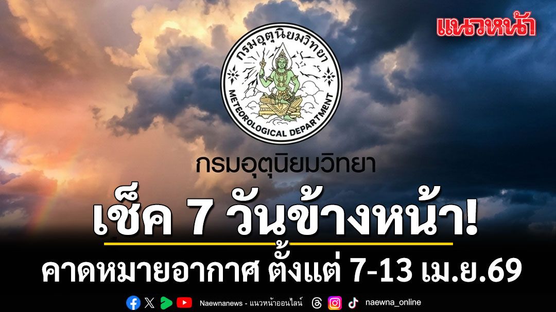 เมื่อเวลา 12.00 น. วันที่ 7 เมษายน 2569 กรมอุตุนิยมวิทยา คาดหมายอากาศทั่วไป พยากรณ์อากาศ 7 วันข้างหน้า ระหว่างวันที่ 7 - 13 เมษายน พ.ศ. 2569 ดังนี้