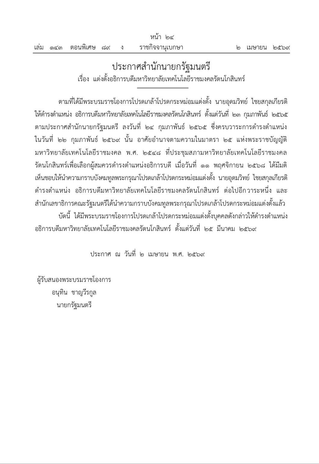บัดนี้ ได้มีพระบรมราชโองการโปรดเกล้าโปรดกระหม่อมแต่งตั้งบุคคลดังกล่าวให้ดำรงตำแหน่ง อธิการบดีมหาวิทยาลัยเทคโนโลยีราชมงคลรัตนโกสินทร์ ตั้งแต่วันที่ 25 มีนาคม 2569