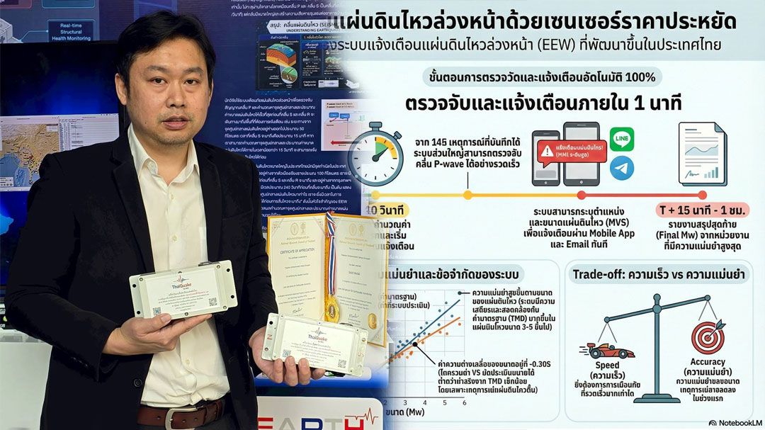 “ปัจจุบันระบบที่พัฒนาโดย Thaiquake by MU เป็นระบบอัตโนมัติ 100% ที่คำนวณตำแหน่งได้ภายใน 1 นาที และคำนวณขนาดแผ่นดินไหวได้ภายใน 2 นาที พร้อมส่งแจ้งเตือนผ่านช่องทางต่าง ๆ เช่น แอปพลิเคชันมือถือ อีเมล และเทเลแกรม ไปยังผู้ดูแลอาคารหรือหน่วยงานที่เกี่ยวข้อง โดยได้รับการสนับสนุนทุนวิจัยจากกองทุนส่งเสริมวิทยาศาสตร์ วิจัยและนวัตกรรม ผ่านสำนักงานการวิจัยแห่งชาติ (วช.) ซึ่งนักวิจัยพยายามพัฒนาให้ใช้เวลาไม่เกิน 2 นาที จากที่ปัจจุบันกรมอุตุนิยมวิทยาใช้เวลานาน 15-30 นาทีในการคำนวณ ทำให้ไม่สามารถเตือนภัยล่วงหน้าได้”