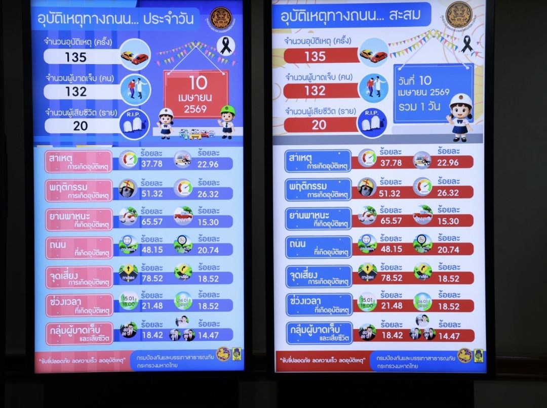เมื่อวันที่ 11 เม.ย.2569 ที่กรมป้องกันและบรรเทาสาธารณภัย (ปภ.) พล.ต.อ.สำราญ นวลมา รองผู้บัญชาการตำรวจแห่งชาติ (รองผบ.ตร.) ในฐานะประธานแถลงข่าวสรุปผลการดำเนินงานของศูนย์อำนวยการป้องกันและลดอุบัติเหตุทางช่วงเทศกาลสงกรานต์ พ.ศ. 2569 เปิดเผยว่า ศูนย์อำนวยการป้องกันและลดอุบัติเหตุทางถนนช่วงเทศกาลสงกรานต์ พ.ศ. 2569 โดยกรมป้องกันและบรรเทาสาธารณภัยและความร่วมมือของภาคีเครือข่ายได้รวบรวมสถิติอุบัติเหตุทางถนน ประจำวันที่ 10เม.ย.69 ซึ่งเป็นวันแรกของการรณรงค์ “ขับขี่ปลอดภัย ลดความเร็ว ลดอุบัติเหตุ” เกิดอุบัติเหตุ 135 ครั้ง ผู้บาดเจ็บ 132 คน ผู้เสียชีวิต 20 ราย สาเหตุที่ทำให้เกิดอุบัติเหตุสูงสุด ได้แก่ ขับรถเร็ว ร้อยละ 37.78 ตัดหน้ากระชั้นชิด ร้อยละ 22.96 ยานพาหนะที่เกิดอุบัติเหตุสูงสุด ได้แก่ รถจักรยานยนต์ ร้อยละ 70.49 ส่วนใหญ่เกิดบนเส้นทางตรง ร้อยละ 78.52 ถนนกรมทางหลวง ร้อยละ 48.15 ถนนใน อบต./หมู่บ้าน ร้อยละ 20.74 ช่วงเวลาที่เกิดอุบัติเหตุสูงสุด ได้แก่ ช่วงเวลา 15.01 – 18.00 น. ร้อยละ 21.48 ผู้บาดเจ็บและเสียชีวิตสูงสุดอยู่ในช่วงอายุ 60 - 69 ปี ร้อยละ 18.42