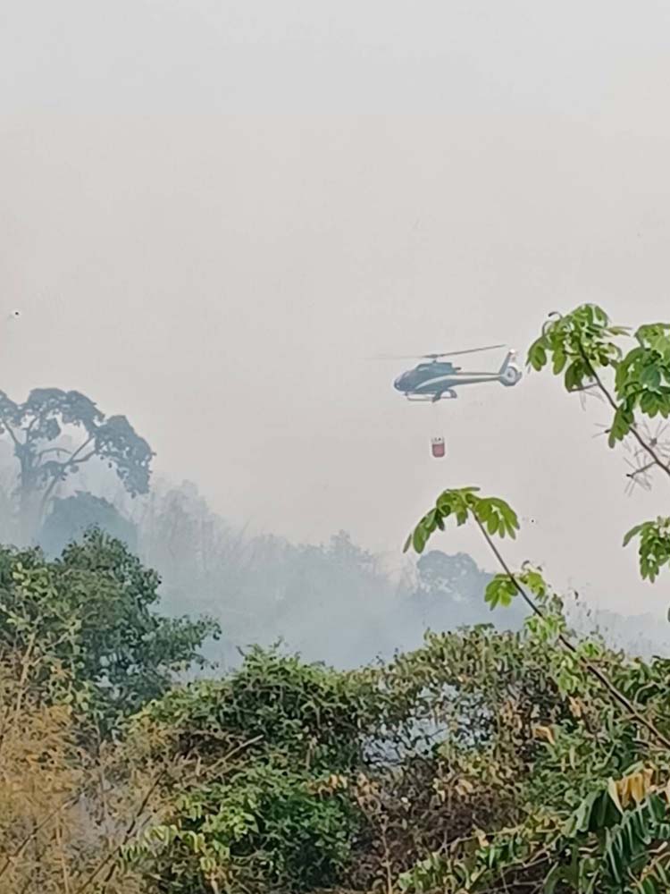 โดย นายวัชระพล กล่าวว่า ได้สั่งการให้สนับสนุนเฮลิคอปเตอร์เข้าปฏิบัติการตักน้ำดับไฟป่าบริเวณภูเขาโดยรอบวัดป่าภูก้อน ซึ่งเป็นพื้นที่ป่ารวมประมาณ 2,500 ไร่ ที่เกิดไฟไหม้ในบางส่วนของพื้นที่ และมีแนวโน้มขยายวงกว้าง เนื่องจากมีกระแสลมกระโชกแรง ส่งผลให้ไฟป่าลุกลามอย่างรวดเร็ว โดยในช่วงเช้าที่ผ่านมาเฮลิคอปเตอร์กรมฝนหลวงและการบินเกษตร ปฏิบัติการตักน้ำดับไฟป่าไปจำนวน 17 เที่ยว เที่ยวละ 500 ลิตร และจะยังติดตามสถานการณ์ดังกล่าวอย่างใกล้ชิด เพื่อลดการลุกลามและผลกระทบต่อทรัพยากรธรรมชาติและคุณภาพอากาศ โดยได้เน้นย้ำการบูรณาการความร่วมมือระหว่างหน่วยงานที่เกี่ยวข้อง ผู้นำท้องถิ่น และชุมชน เพื่อให้สามารถควบคุมสถานการณ์ได้โดยเร็วที่สุด