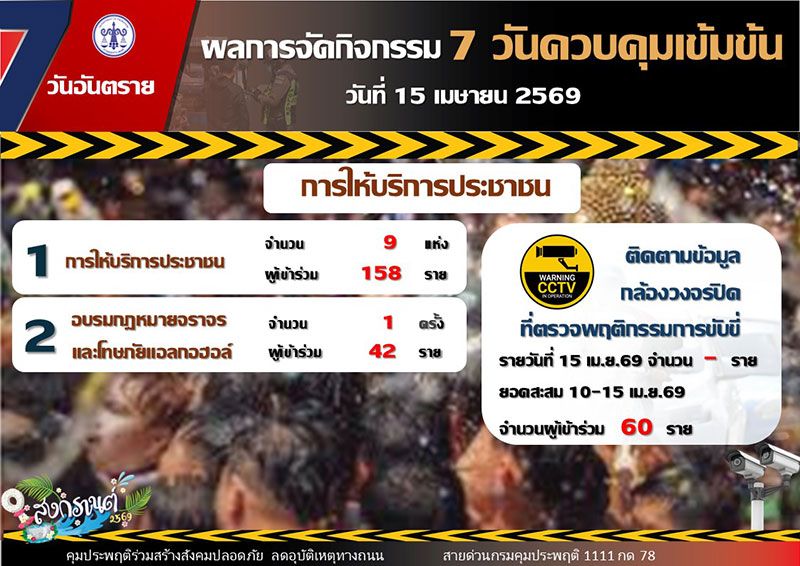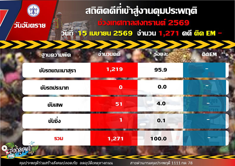 16 เมษายน 2569 ร้อยตำรวจเอก ปิยะ รักสกุล อธิบดีกรมคุมประพฤติ เปิดเผยผลการติดตามสถานการณ์คดีในช่วงเทศกาลสงกรานต์ พ.ศ. 2569 ว่า เมื่อวันที่ 15 เมษายน 2569 ซึ่งเป็นวันที่ 6 ของการดำเนินมาตรการควบคุมเข้มข้น พบว่ามีคดีเข้าสู่กระบวนการคุมความประพฤติ รวมทั้งสิ้น 1,271 คดี แบ่งออกเป็น คดีขับรถขณะเมาสุรา จำนวน 1,219 คดี คิดเป็นร้อยละ 95.9 คดีขับเสพ จำนวน 51 คดี คิดเป็นร้อยละ 4.0 และคดีขับซิ่ง จำนวน 1 คดี คิดเป็นร้อยละ 0.1