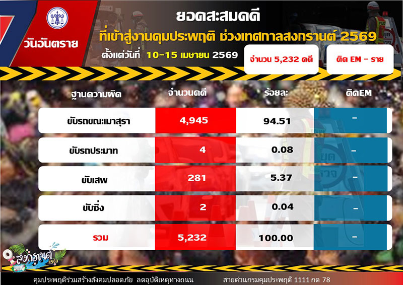 ขณะที่ยอดคดีสะสมตลอด 6 วัน (10 – 15 เมษายน 2569) จำนวนทั้งสิ้น 5,232 คดี แบ่งเป็น คดีขับรถขณะเมาสุรา จำนวน 4,945 คดี คิดเป็นร้อยละ 94.51 คดีขับรถประมาท จำนวน 4 คดี คิดเป็นร้อยละ 0.08 คดีขับเสพ จำนวน 281 คดี คิดเป็นร้อยละ 5.37 และคดีขับซิ่ง จำนวน 2 คดี คิดเป็นร้อยละ 0.04