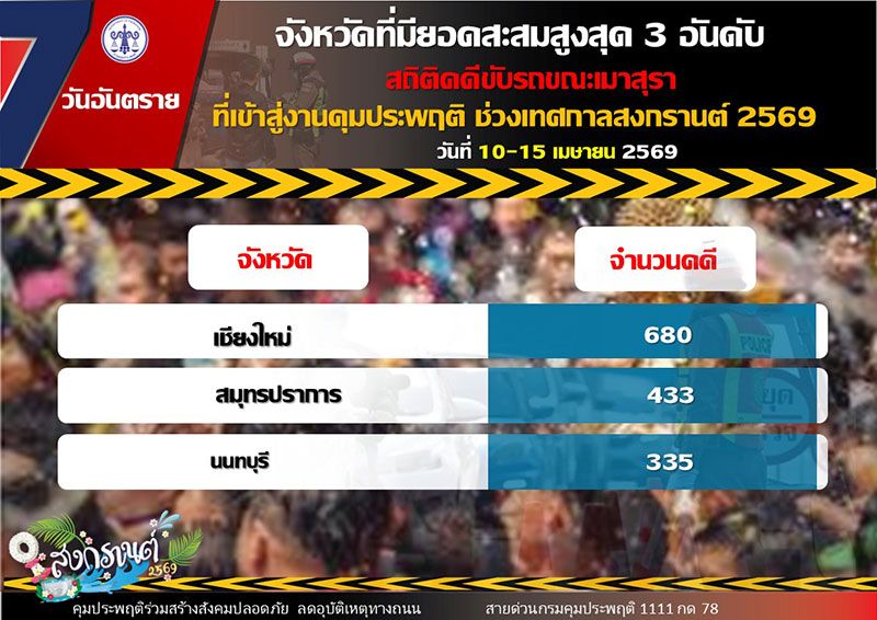 สำหรับจังหวัดที่มีสถิติคดีขับรถขณะเมาสุราสูงสุด 3 อันดับแรก ได้แก่ 1. จังหวัดเชียงใหม่ จำนวน 680 คดี 2. จังหวัดสมุทรปราการ จำนวน 433 คดี และจังหวัดนนทบุรี จำนวน 335 คดี
