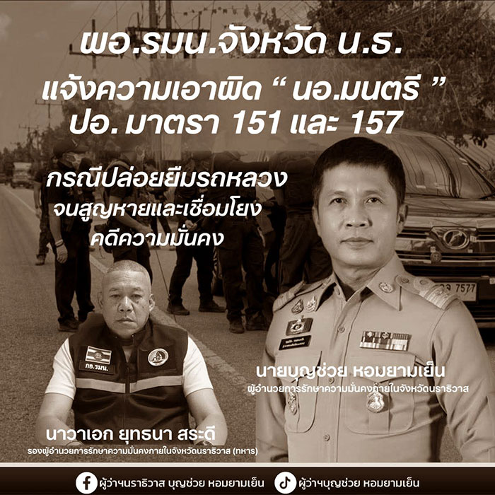 [ ปริศนายังคงมีอยู่หลังแจ้งความนาวาเอก นายกฯ ต้องกำชับตำรวจทำคดีตรงไปตรงมา ] - ความคืบหน้าล่าสุดกรณีการใช้รถยนต์ กอ.รมน. ไปลอบยิง สส.กมลศักดิ์ ก็คือเมื่อวานนี้ทางผู้ว่าฯ นราธิวาส ในฐานะ ผอ.รมน.นราธิวาส ได้มอบหมายให้ นอ.ยุทธนา สระดี รอง ผอ.รมน.นราธิวาส (คล้าย ๆ รองผู้ว่าฯ ฝ่ายทหาร) ไปแจ้งความร้องทุกข์เพื่อดำเนินคดีกับ นอ.มนตรี โตประเสริฐ ผู้ใต้บังคับบัญชาของท่าน ในฐานความผิดตามมาตรา 151 และ 157 ตามประมวลกฎหมายอาญา โดยมีการเน้นย้ำด้วยว่ามีความเชื่อมโยงกับ #คดีความมั่นคง
