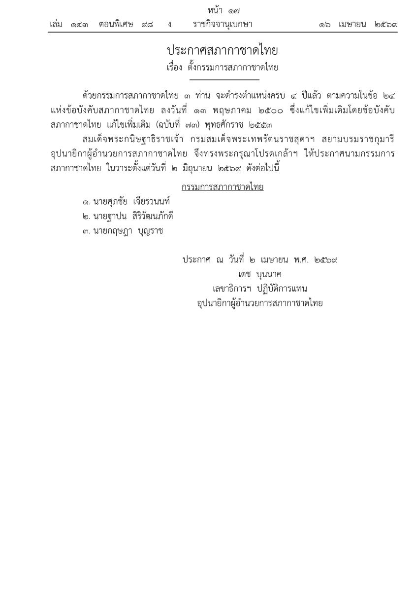 16 เมษายน 2569 ราชกิจจานุเบกษา เผยแพร่ ประกาศสภากาชาดไทย เรื่อง ตั้งกรรมการสภากาชาดไทย มีเนื้อหาว่า ด้วยกรรมการสภากาชาดไทย 3 ท่าน จะดำรงตำแหน่งครบ 4 ปีแล้ว ตามความในข้อ 24 แห่งข้อบังคับสภากาชาดไทย ลงวันที่ 13 พฤษภาคม 2500 ซึ่งแก้ไขเพิ่มเติมโดยข้อบังคับสภากาชาดไทย แก้ไขเพิ่มเติม (ฉบับที่ 73) พุทธศักราช 2553