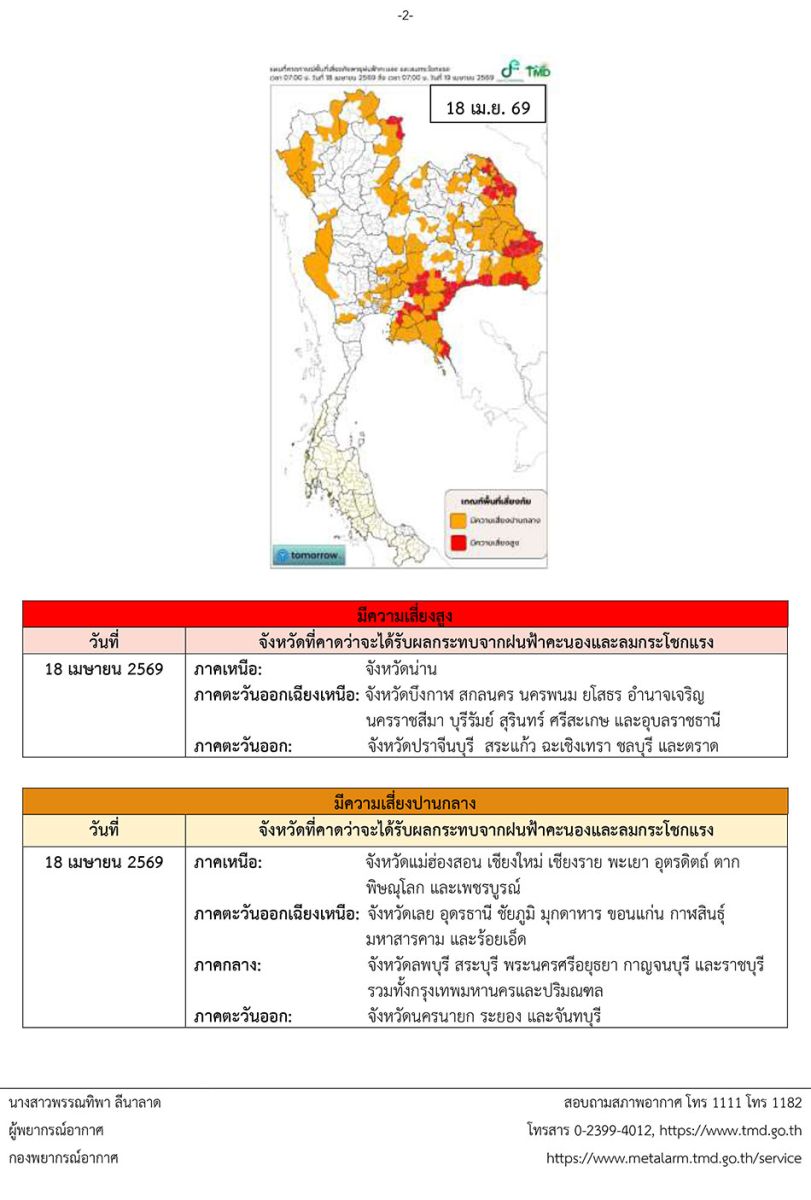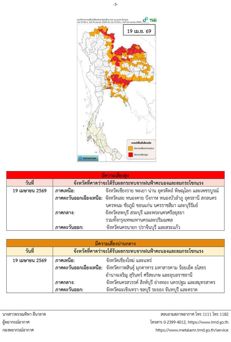 กรมอุตุนิยมวิทยา ประกาศ เรื่อง พายุฤดูร้อนบริเวณประเทศไทยตอนบน (มีผลกระทบจนถึงวันที่ 20 เมษายน 2569) ฉบับที่ 8 (27/2569)