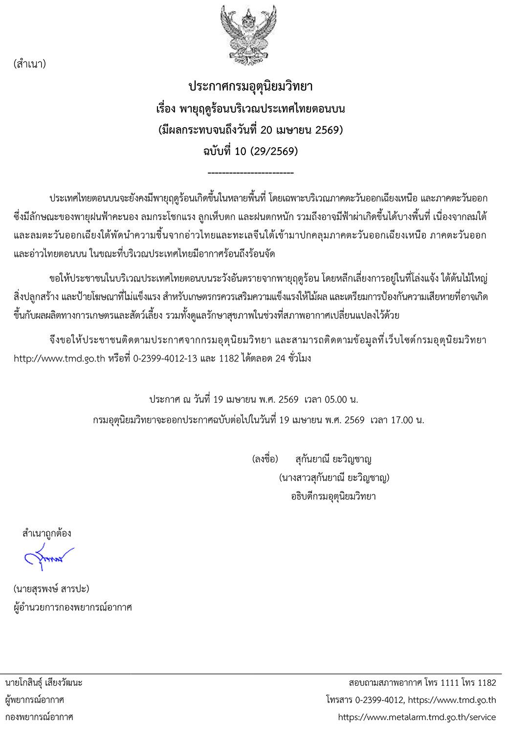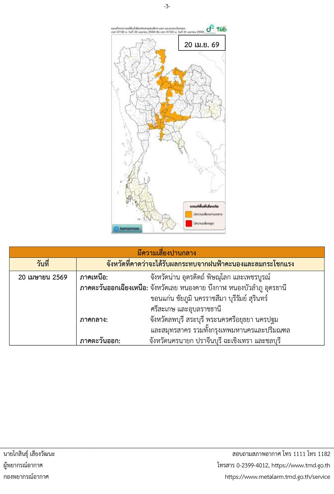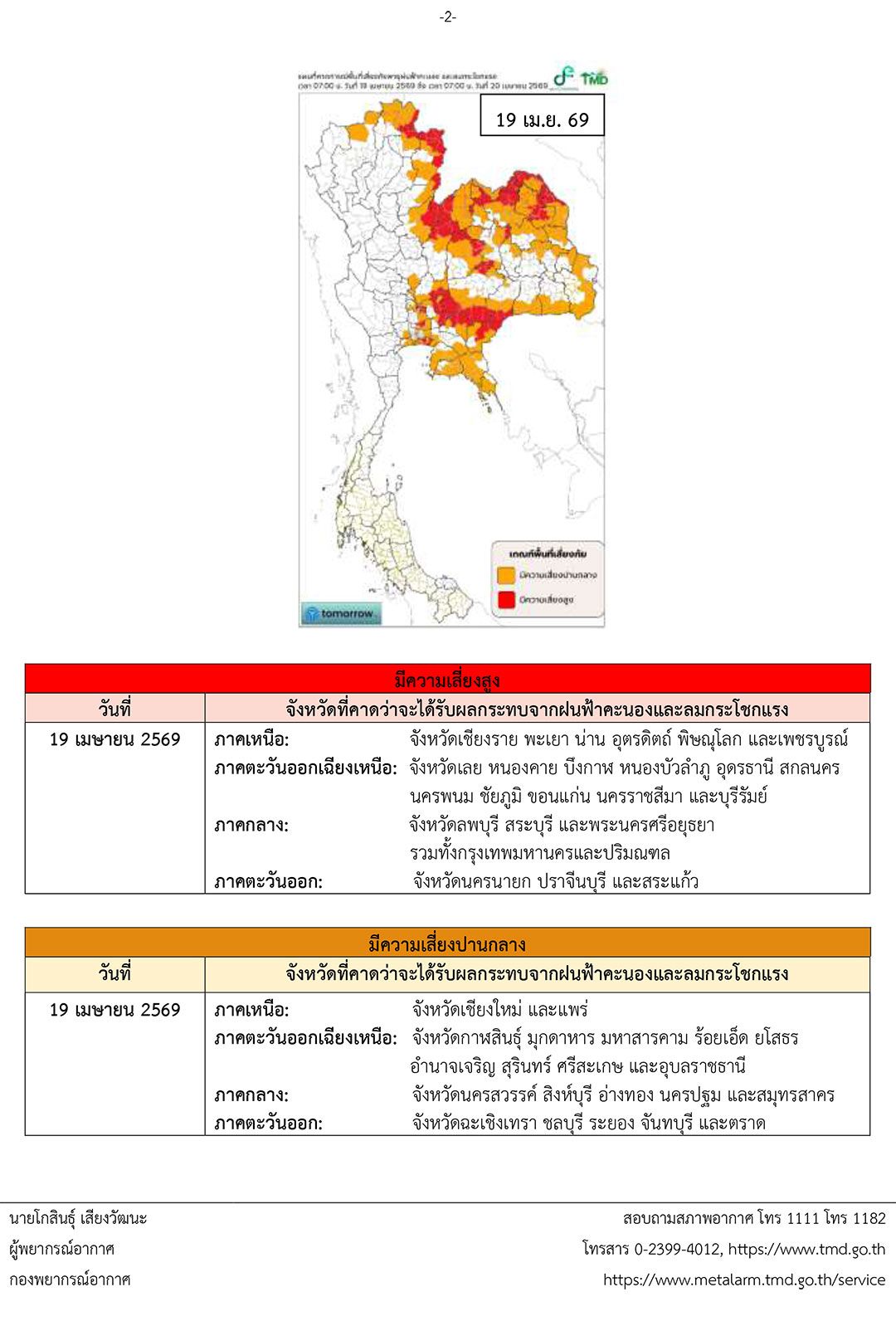 19 เมษายน 2569 เมื่อเวลา 05.00 น. กรมอุตุนิยมวิทยา ประกาศเรื่อง พายุฤดูร้อนบริเวณประเทศไทยตอนบน (มีผลกระทบจนถึงวันที่ 20 เมษายน 2569) ฉบับที่ 10 (29/2569) ดังนี้
