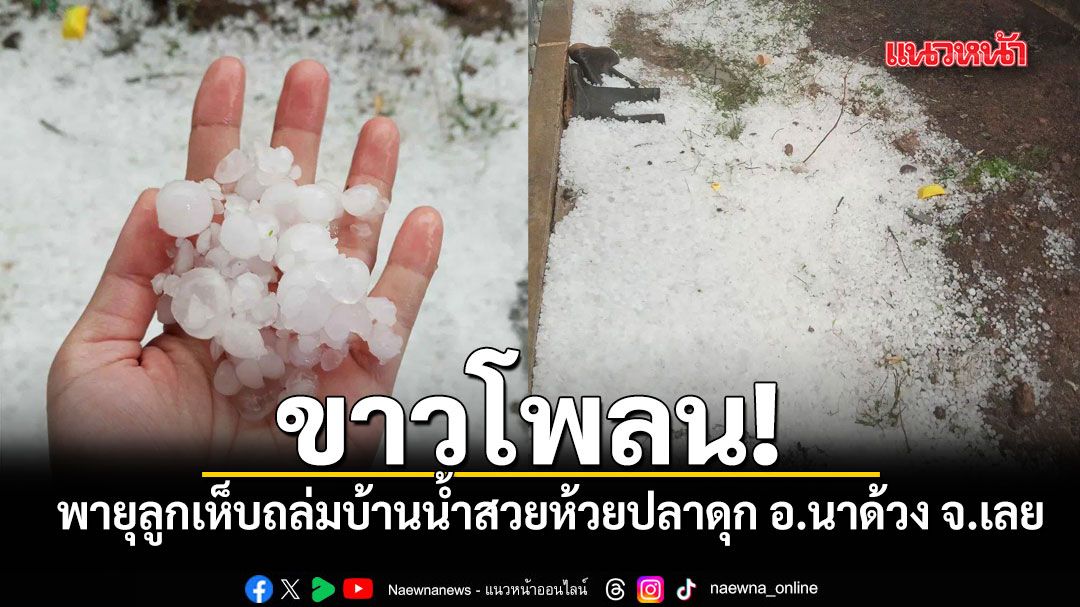 เมื่อวันที่ 19 เม.ย.2569 ผู้สื่อข่าวรายงานว่า เมื่อช่วงเย็นที่ผ่านมา ได้เกิดพายุฝนฟ้าคะนองและลมกระโชกแรงในพื้นที่ อ.นาด้วง จ.เลย โดยจุดที่ได้รับผลกระทบหนักคือ บ้านน้ำสวยห้วยปลาดุก ซึ่งมีลูกเห็บตกลงมาอย่างหนักเป็นจำนวนมาก จนขาวโพลน