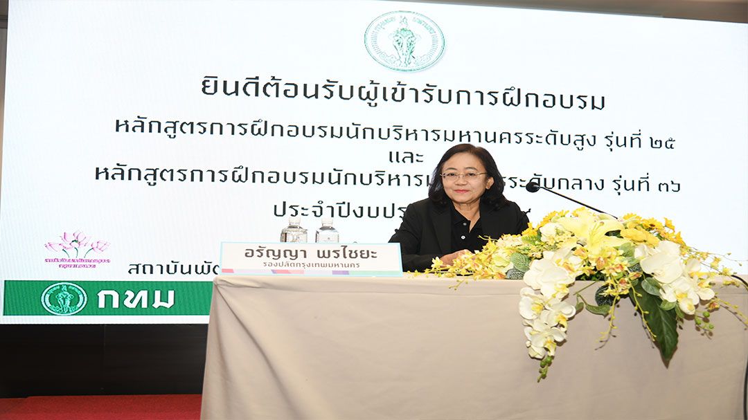 นางสาวอรัญญา พรไชยะ รองปลัดกรุงเทพมหานคร เป็นประธานในพิธีเปิดโครงการพัฒนาศักยภาพของนักบริหารและเตรียมความพร้อมการเป็นผู้นำในการปฏิบัติภารกิจของเมืองในอนาคต (หลักสูตรนักบริหารมหานครระดับสูง รุ่นที่ 25 และหลักสูตรนักบริหารมหานครระดับกลาง รุ่นที่ 36) โดยมีนายอดิศักดิ์ ปานด่วน ผู้อำนวยการสถาบันพัฒนาทรัพยากรบุคคลกรุงเทพมหานคร สำนักงานคณะกรรมการข้าราชการกรุงเทพมหานคร (สำนักงาน ก.ก.) พร้อมผู้บริหารและผู้เข้ารับการอบรม ร่วมพิธี ณ ห้องมิ่งเมือง ชั้น 4 โรงแรมเดอะ ทวิน ทาวเวอร์ เขตปทุมวัน โดยกล่าวว่า “ขอให้ยึดหลักการบริหารอย่างมีคุณธรรม มุ่งมั่นทำงานอย่างมืออาชีพ โดยมีจุดเน้นสำคัญคือ ‘สร้างคน สร้างเมือง’ ควบคู่การพัฒนา Upskill และ Reskill เพื่อก้าวสู่การเป็นผู้นำที่มีวิสัยทัศน์ และสามารถนำนโยบายไปสู่การปฏิบัติได้อย่างมีประสิทธิภาพ”
