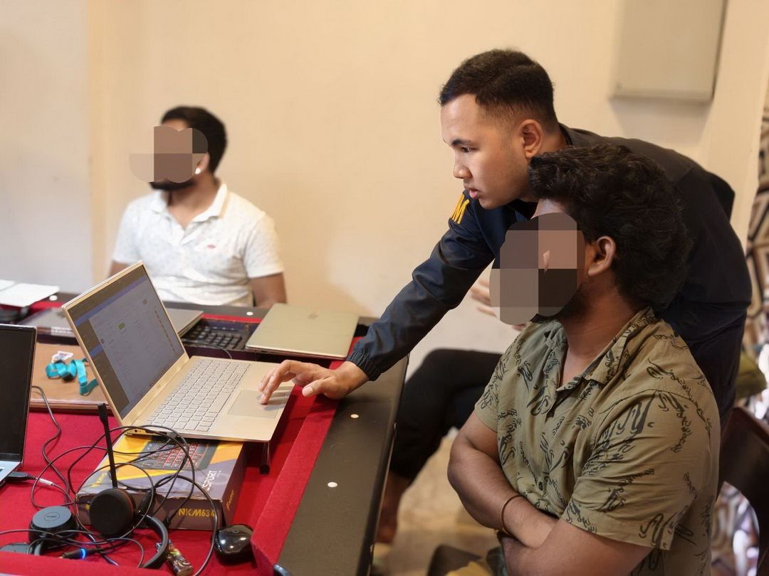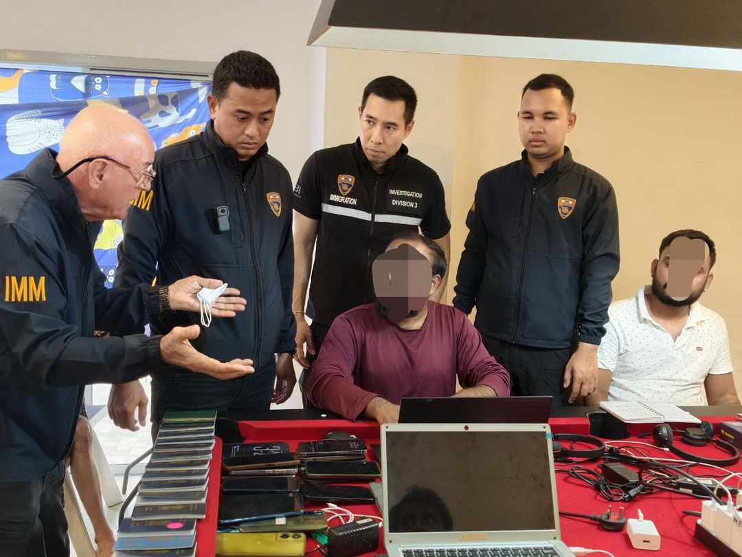 โดยเจ้าหน้าที่ได้ใช้อุบายวางแผนปลอมตัวเป็นช่างไฟฟ้าเข้าไปติดต่อสอบถามข้อมูลเพื่อยืนยันเป้าหมาย ก่อนจะแสดงตัวเข้าตรวจสอบแบบไม่ทันตั้งตัว พบชาวอินเดียรวม 30 คน แบ่งเป็นกลุ่มพนักงาน 19 คน กำลังทำงานอยู่หน้าคอมพิวเตอร์ และอีก 11 คนพักผ่อนอยู่ชั้นบน โดยมี MR.SANDEEP อายุ 40 ปี สัญชาติอินเดีย รับสารภาพเป็นหัวหน้ากลุ่ม (บิ๊กบอส) พร้อมยึดของกลางคอมพิวเตอร์โน้ตบุ๊ก 22 เครื่อง โทรศัพท์มือถือ 49 เครื่อง และสมุดบัญชีการเงิน
