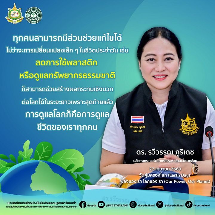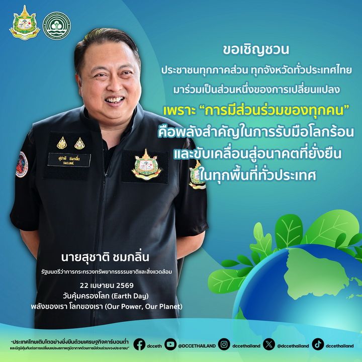 รัฐบาลได้ให้ความสำคัญกับการแก้ไขปัญหาที่เกี่ยวข้องกับทรัพยากรธรรมชาติและสิ่งแวดล้อมมาอย่างต่อเนื่อง ซึ่งส่งผลกระทบต่อคุณภาพชีวิตของพี่น้องประชาชนในทุกระดับ โดยเฉพาะเรื่องของการเปลี่ยนแปลงสภาพภูมิอากาศและสิ่งแวดล้อม รวมทั้งได้กำหนดนโยบายขับเคลื่อนร่วมกับทุกภาคส่วน เชื่อมโยงกับนานาชาติอย่างเป็นรูปธรรมตามที่นายอนุทิน ชาญวีรกูล นายกรัฐมนตรีได้แถลงนโยบายต่อรัฐสภาไปเมื่อวันที่ 9-10 เมษายน 2569 ที่ผ่านมา โดยเฉพาะในด้านภัยพิบัติและสิ่งแวดล้อม ได้แก่ การบริหารจัดการน้ำและป้องกันภัยพิบัติอย่างเป็นระบบ การพัฒนาระบบประกันภัยพิบัติแห่งชาติ การผลักดันให้ประเทศบรรลุเป้าหมายการปล่อยก๊าซเรือนกระจกสุทธิให้เป็นศูนย์ภายในปี ค.ศ. 2050 และการอนุรักษ์และใช้ประโยชน์ทรัพยากรธรรมชาติอย่างมีคุณค่าและสมดุล และได้ให้ทุกหน่วยงานบูรณาการความร่วมมือกับทุกภาคส่วนอย่างต่อเนื่อง รวมทั้งสื่อสารสร้างความรู้ ความเข้าใจให้ประชาชน เพื่อช่วยกันรักษาสิ่งแวดล้อม ลดผลกระทบและพร้อมตั้งรับปรับตัวต่อการเปลี่ยนแปลงสภาพภูมิอากาศ ประกอบกับวันนี้เป็นวันคุ้มครองโลก (Earth Day) ซึ่งตรงกับวันที่ 22 เมษายนของทุกปี ซึ่งเป็นอีกหนึ่งวันสำคัญทางสิ่งแวดล้อมที่ทุกประเทศให้ความสำคัญและร่วมกันจัดกิจกรรมเพื่อแสดงพลังการมีส่วนร่วมในการสร้างความตระหนักเกี่ยวกับการอนุรักษ์สิ่งแวดล้อม ส่งเสริมการอนุรักษ์ทรัพยากรธรรมชาติ กระตุ้นให้เกิดการเปลี่ยนแปลงพฤติกรรมในชีวิตประจำวัน และสนับสนุนแนวคิดการใช้ชีวิตอย่างยั่งยืน
