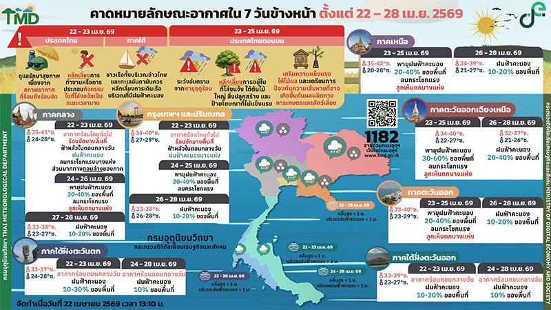 ส่วนในช่วงวันที่ 26 - 29 เม.ย. 69 มีฝนฟ้าคะนอง ร้อยละ 10 – 20 ของพื้นที่ลมใต้ ความเร็ว 10 - 20 กม./ชม.อุณหภูมิต่ำสุด 26 – 28 องศาเซลเซียส อุณหภูมิสูงสุด 34 – 39 องศาเซลเซียส