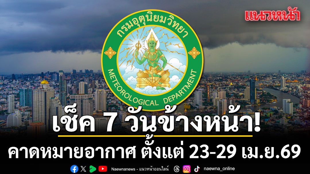เมื่อเวลา 12.00 น. วันที่ 23 เมษายน 2569 กรมอุตุนิยมวิทยา คาดหมายอากาศทั่วไป พยากรณ์อากาศ 7 วันข้างหน้า ระหว่างวันที่ 23 - 29 เมษายน พ.ศ. 2569 ดังนี้