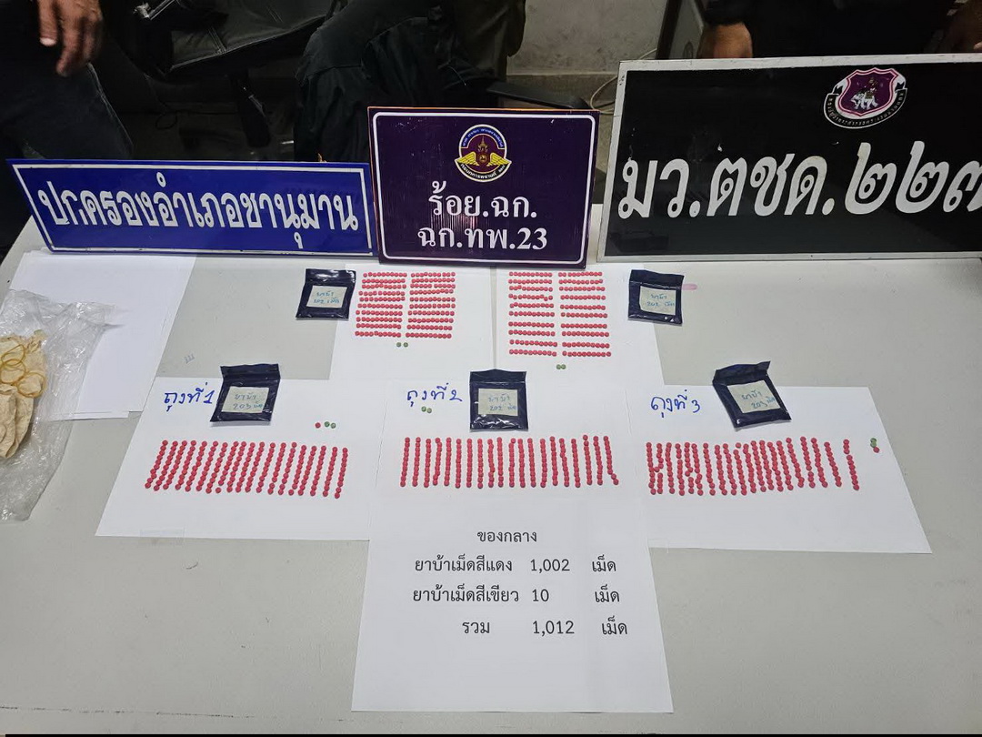 จากการตรวจสอบบริเวณโดยรอบที่ผู้ต้องหาวิ่งผ่าน พบห่อบรรจุ ยาบ้าจำนวน 1,012 เม็ด ตกอยู่ข้างกำแพงหลังบ้าน เจ้าหน้าที่จึงทำการตรวจยึดไว้เป็นของกลางพร้อมควบคุมตัวผู้ต้องหา
