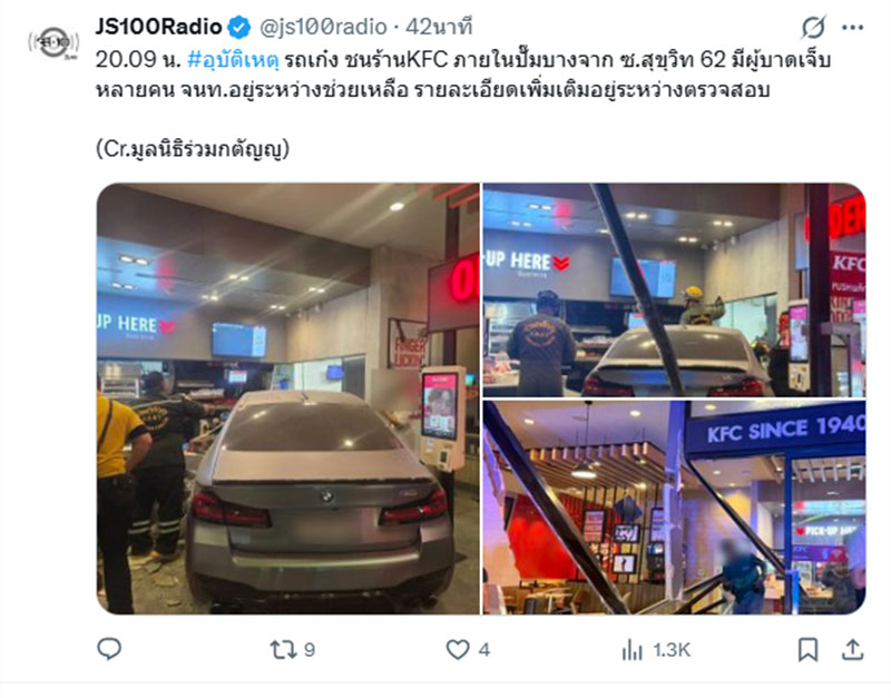 วันที่ 25 เมษายน 2569 เวลา 20.09 น. มีรายงานว่า เกิดเหตุรถพุ่งชนร้านไก่ทอดเจ้าดังในปั๊มแห่งหนึ่ง ปากซอยสุขุมวิท 62 เบื้องต้นมีผู้บาดเจ็บ 6 ราย จนท.อยู่ระหว่างช่วยเหลือ รายละเอียดเพิ่มเติมอยู่ระหว่างตรวจสอบ