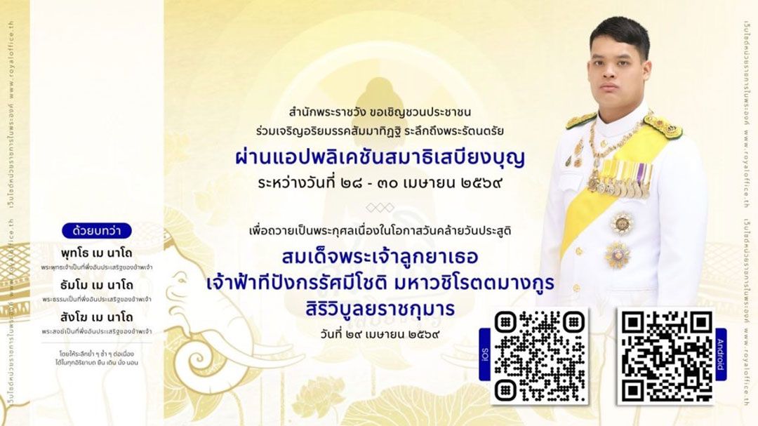 โอกาสนี้ สำนักพระราชวัง ขอเชิญชวนประชาชนร่วมเจริญอริยมรรค “สัมมาทิฏฐิ” ระลึกถึงพระรัตนตรัย ว่าเป็นสรณะที่พึ่งที่ยึดถือ อันเป็นทางเป็นธรรมที่พระพุทธองค์ได้ตรัสไว้โดยชอบ เพื่อถวายเป็นพระกุศล เนื่องในโอกาสวันคล้ายวันประสูติ สมเด็จพระเจ้าลูกยาเธอ เจ้าฟ้าทีปังกรรัศมีโชติ มหาวชิโรตตมางกูร สิริวิบูลยราชกุมาร ระหว่างวันที่ 28 - 30 เมษายน 2569 ทั้งนี้ สามารถดาวน์โหลดแอปพลิเคชันได้ทั้ง PLAY STORE และ APP STORE