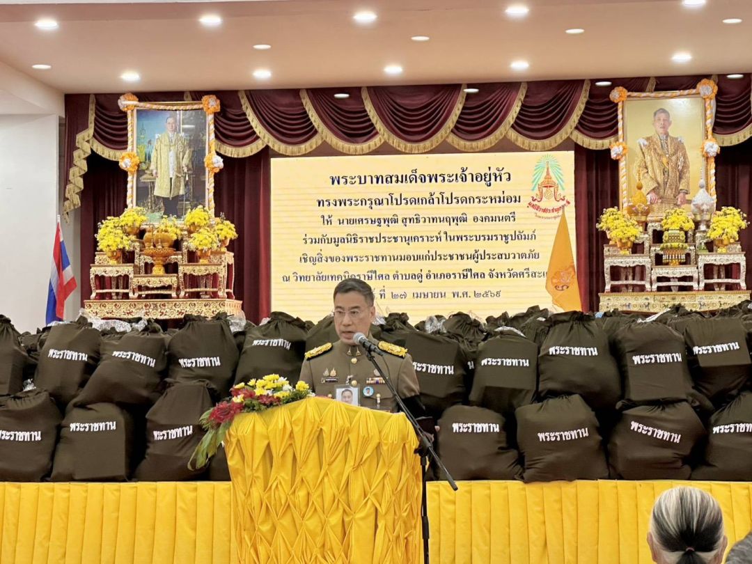 วันที่ 27 เมษายน 2569 เวลา 10.33 น. พระบาทสมเด็จพระเจ้าอยู่หัว ทรงพระกรุณาโปรดเกล้า โปรดกระหม่อมให้ นายเศรษฐพุฒิ สุทธิวาทนฤพุฒิ องคมนตรี ร่วมกับมูลนิธิราชประชานุเคราะห์ ในพระบรมราชูปถัมภ์ เชิญถุงพระราชทานและเครื่องอุปโภคบริโภค จำนวน 720 ถุง ไปมอบแก่ผู้ว่าราชการจังหวัด นายอำเภอ ซึ่งเป็นตัวแทนราษฎร เพื่อเชิญไปมอบแก่ราษฎรที่ประสบวาตภัยในพื้นที่จังหวัดศรีสะเกษต่อไป และมอบแก่ราษฎรอำเภอราษีไศล ณ วิทยาลัยเทคนิคราษีไศล อำเภอราษีไศล จังหวัดศรีสะเกษ เพื่อช่วยบรรเทาความเดือดร้อนในเบื้องต้น และเป็นขวัญกำลังใจ