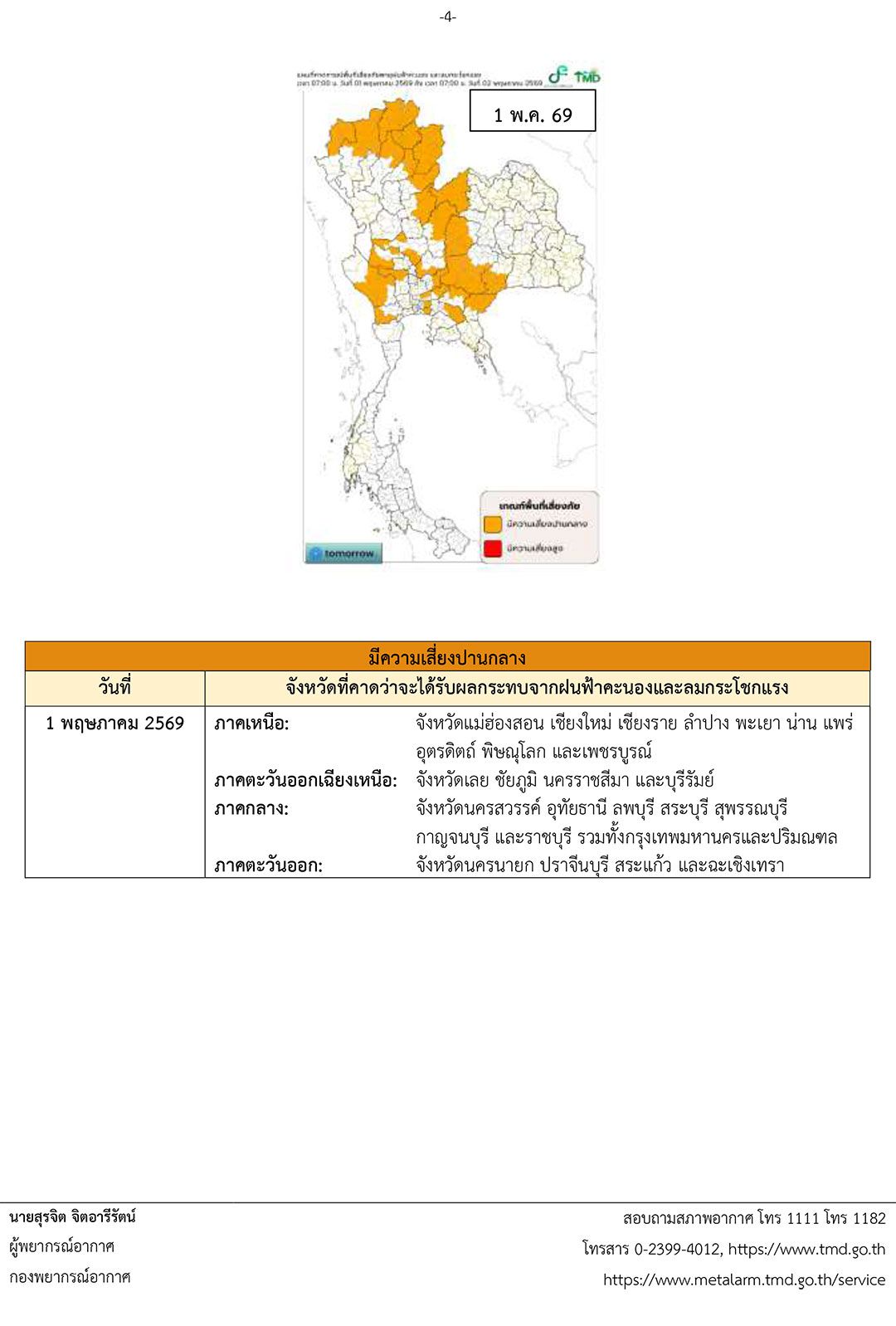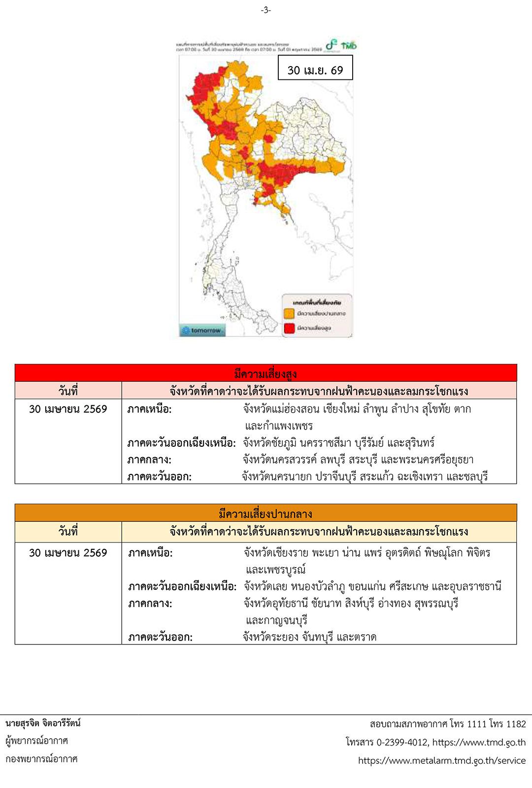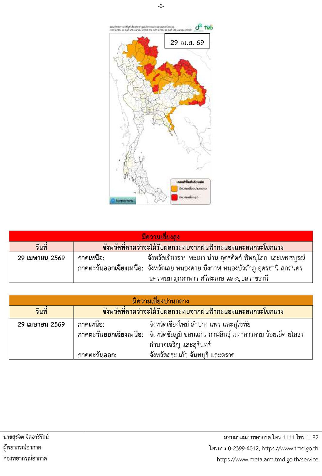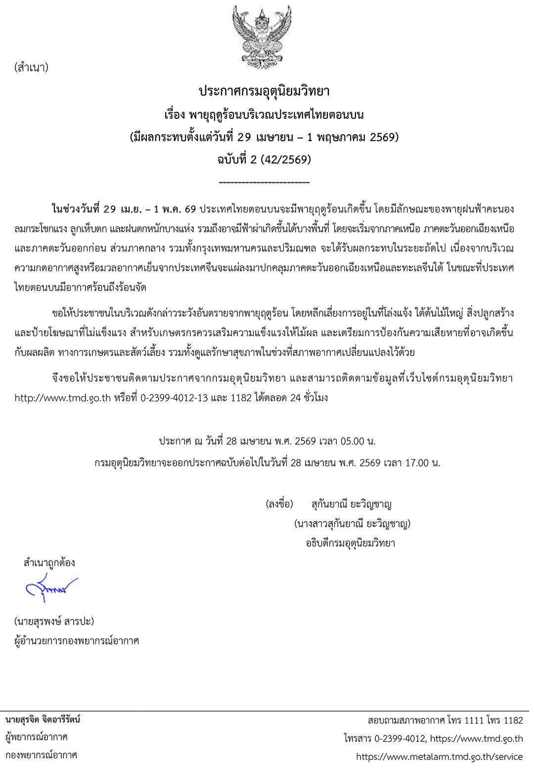 28 เมษายน 2569 เมื่อเวลา 05.00 น.กรมอุตุนิยมวิทยา ประกาศเรื่อง พายุฤดูร้อนบริเวณประเทศไทยตอนบน (มีผลกระทบตั้งแต่วันที่ 29 เมษายน - 1 พฤษภาคม 2569) ฉบับที่ 2 (42/2569) ดังนี้