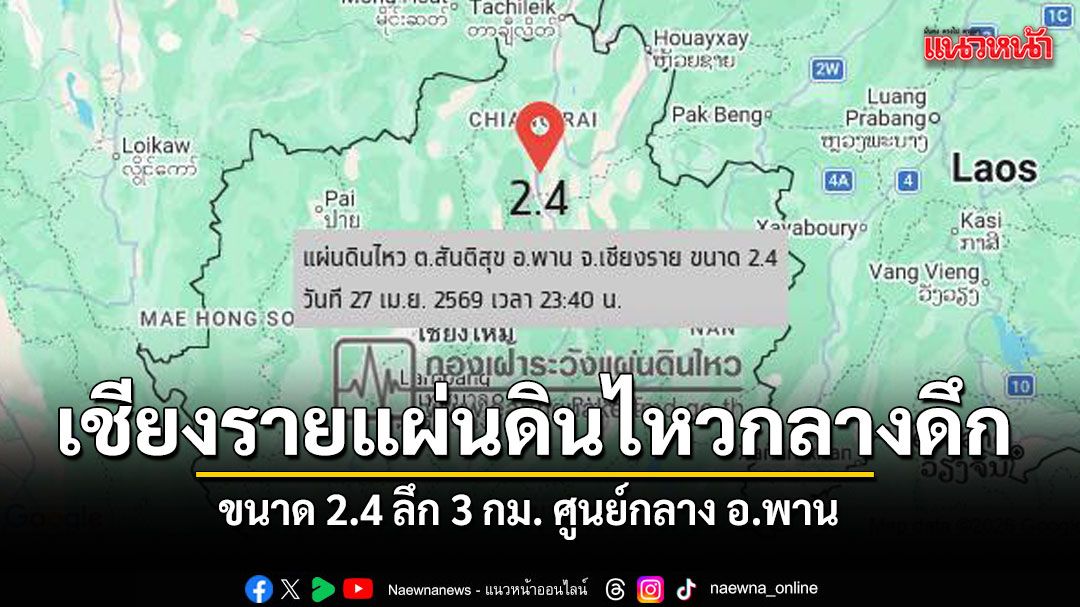 28 เมษายน 2569 เมื่อเวลา 23.40 น. กลางดึกวันที่ 27 เมษายน กองเฝ้าระวังแผ่นดินไหว กรมอุตุนิยมวิทยา รายงานเหตุแผ่นดินไหวขนาด 2.4 ความลึก 3 กิโลเมตร ศูนย์กลางอยู่ที่ ต.สันติสุข อ.พาน จ.เชียงราย