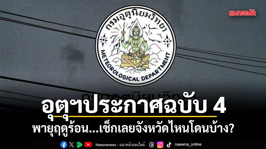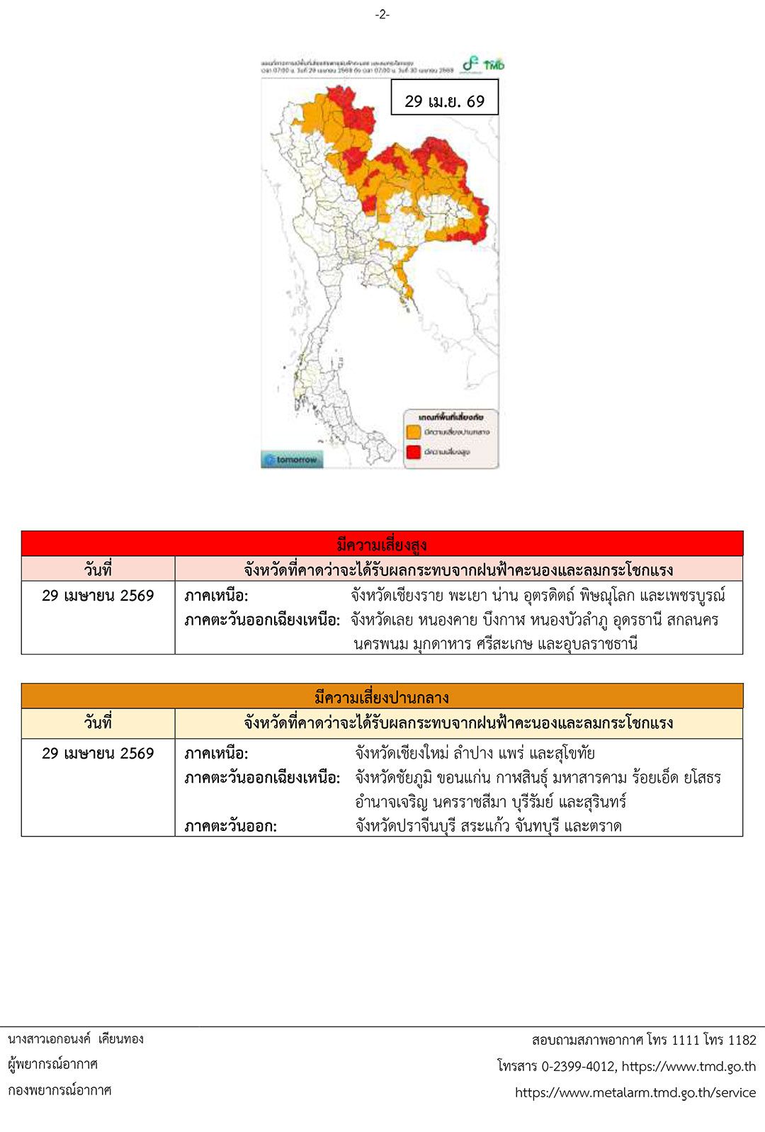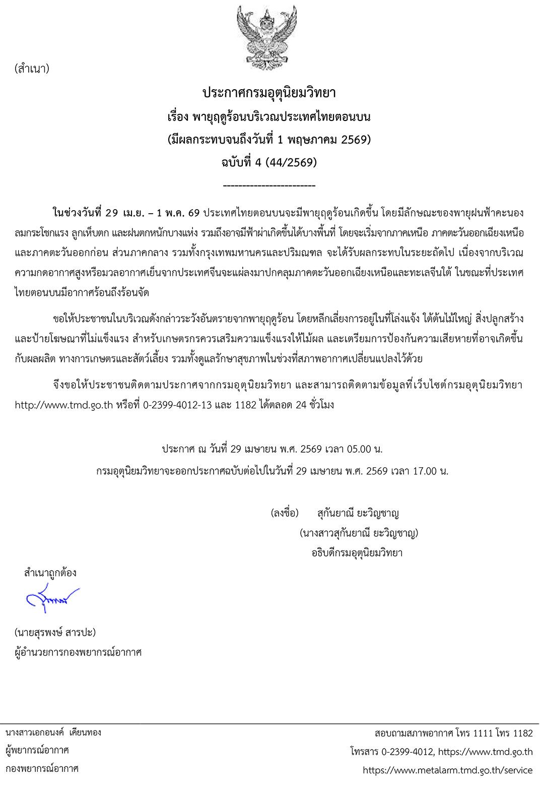 29 เมษายน 2569 เวลา 05.00 น. กรมอุตุนิยมวิทยา ประกาศเรื่อง พายุฤดูร้อนบริเวณประเทศไทยตอนบน (มีผลกระทบจนถึงวันที่ 1 พฤษภาคม 2569) ฉบับที่ 4 (44/2569) ดังนี้