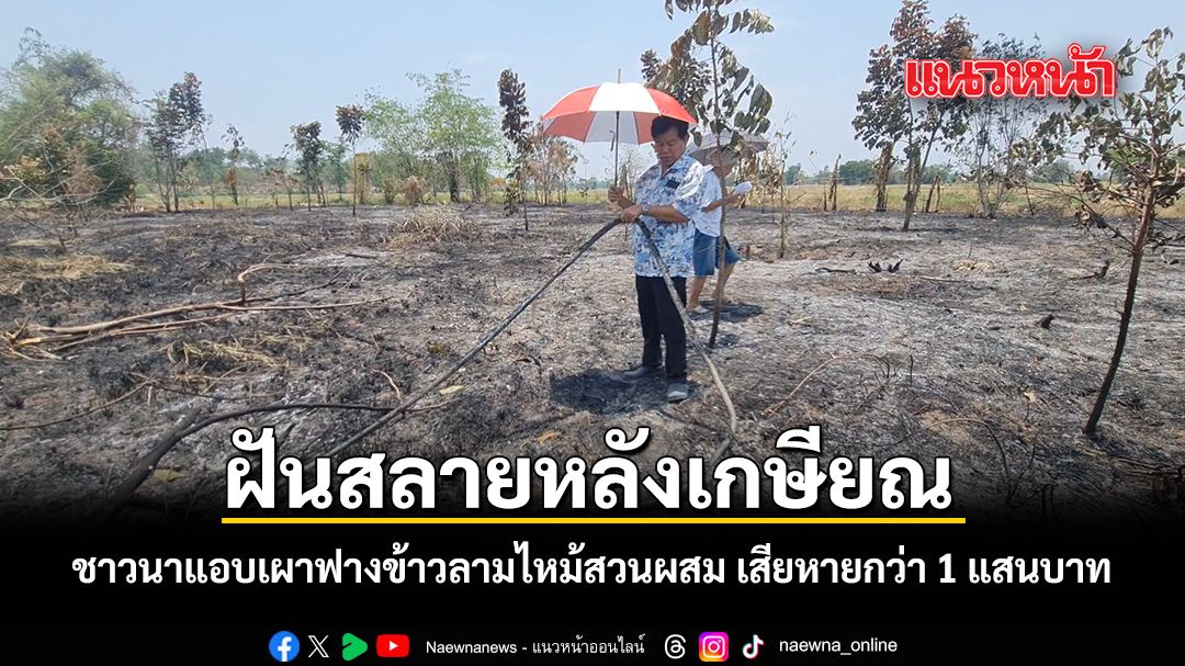 ปีที่แล้ว (2568) ชาวนาจุดไฟเผาฟาง ลุกลามไหม้พื้นที่ 2 ไร่ ทำมะม่วงตายไปเกือบ 40 ต้น พอมาปีนี้ (2569) กลับเจอหนักกว่าเดิม ไฟลุกลามไหม้พื้นที่เกือบ 5 ไร่ ทำต้นไม้ตายเกือบหมด โดยเฉพาะต้นมะริด ไม้ป่าหายาก ซื้อมาเป็นสิบต้น ราคาต้นละ 1,500 บาท ตนกับภรรยาคอยเดินหิ้วถังรดน้ำ เฝ้าดูแลมาถึง 4 ปี ตอนนี้ไม่เหลือเลยแม้แต่ต้นเดียว รู้สึกเสียดายมาก เพราะกว่าต้นไม้จะโตมันใช้เวลานาน