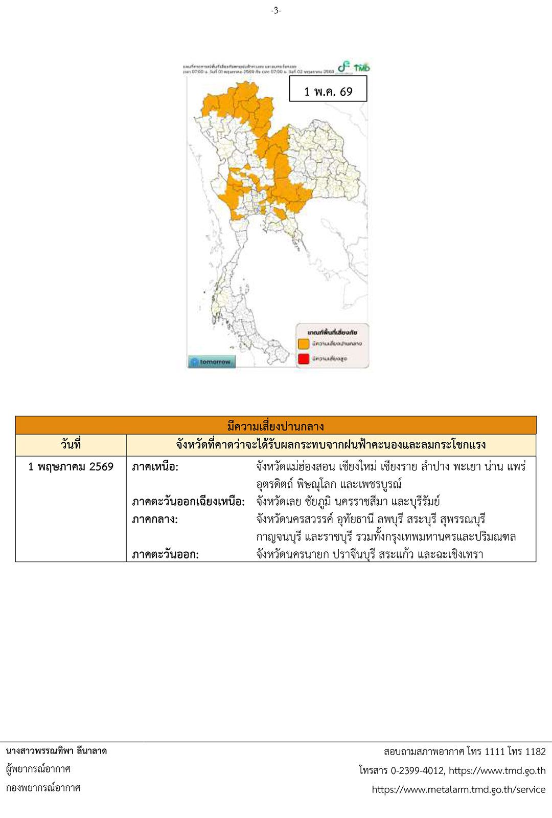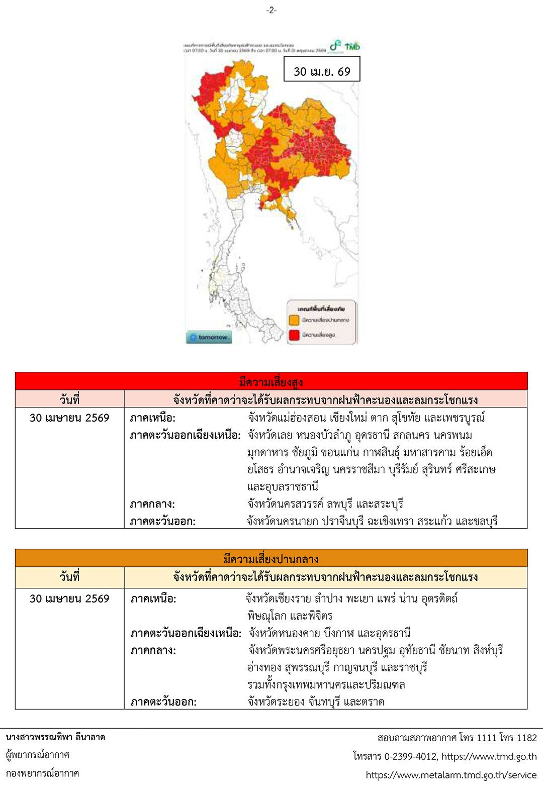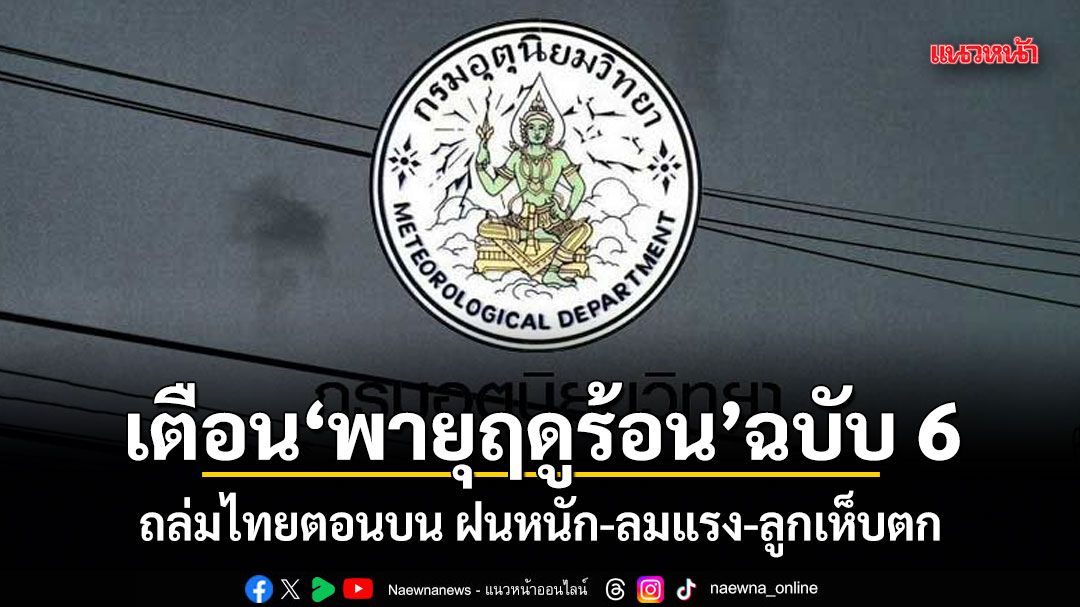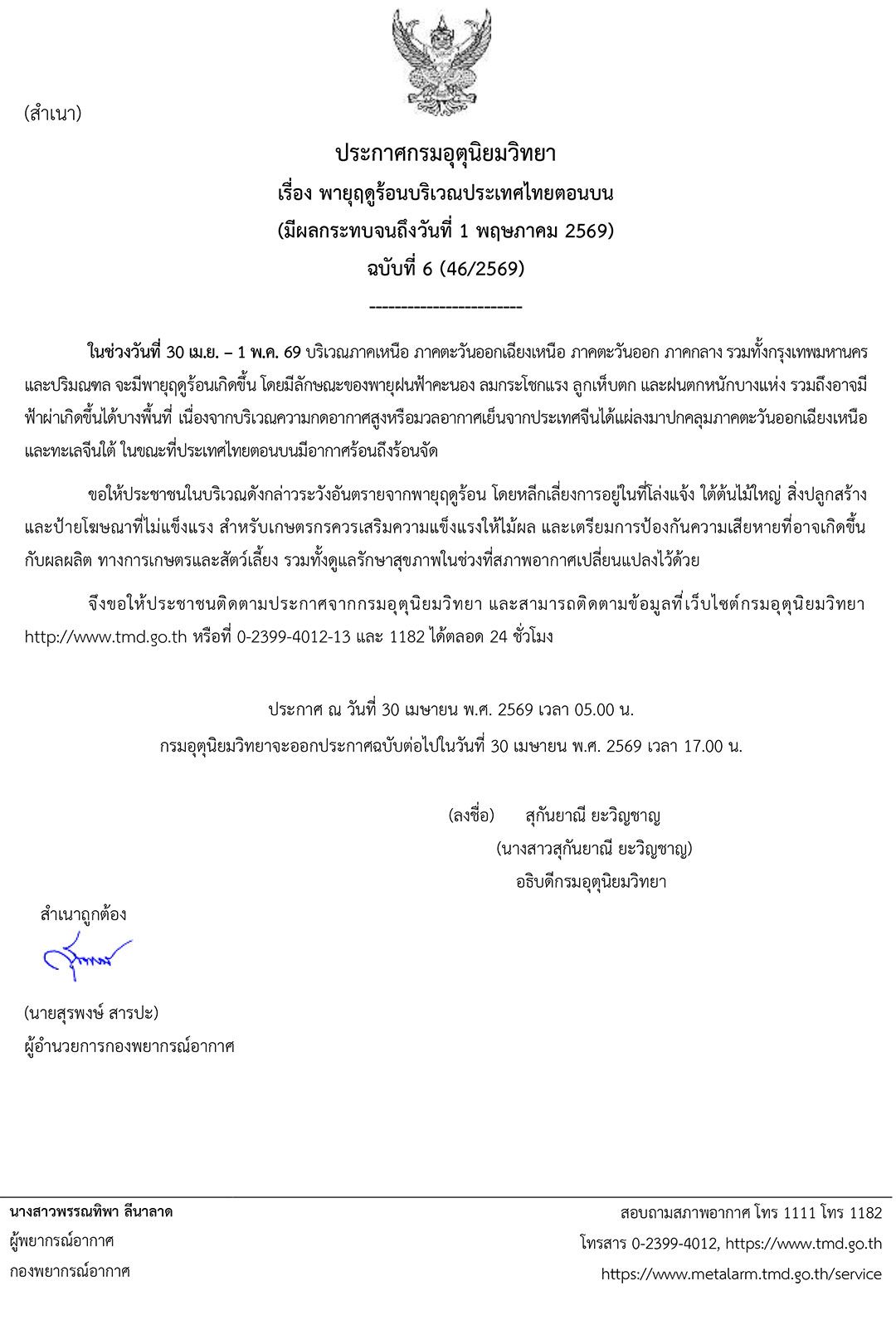 30 เมษายน 2569 เวลา 05.00 น. กรมอุตุนิยมวิทยา ประกาศเรื่อง พายุฤดูร้อนบริเวณประเทศไทยตอนบน (มีผลกระทบจนถึงวันที่ 1 พฤษภาคม 2569) ฉบับที่ 6 (46/2569) ดังนี้