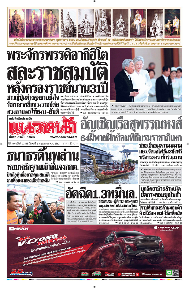 ปีที่ 40 ฉบับที่ 13579 ประจำวัน พุธ ที่ 1 พฤษภาคม พ.ศ. 2562