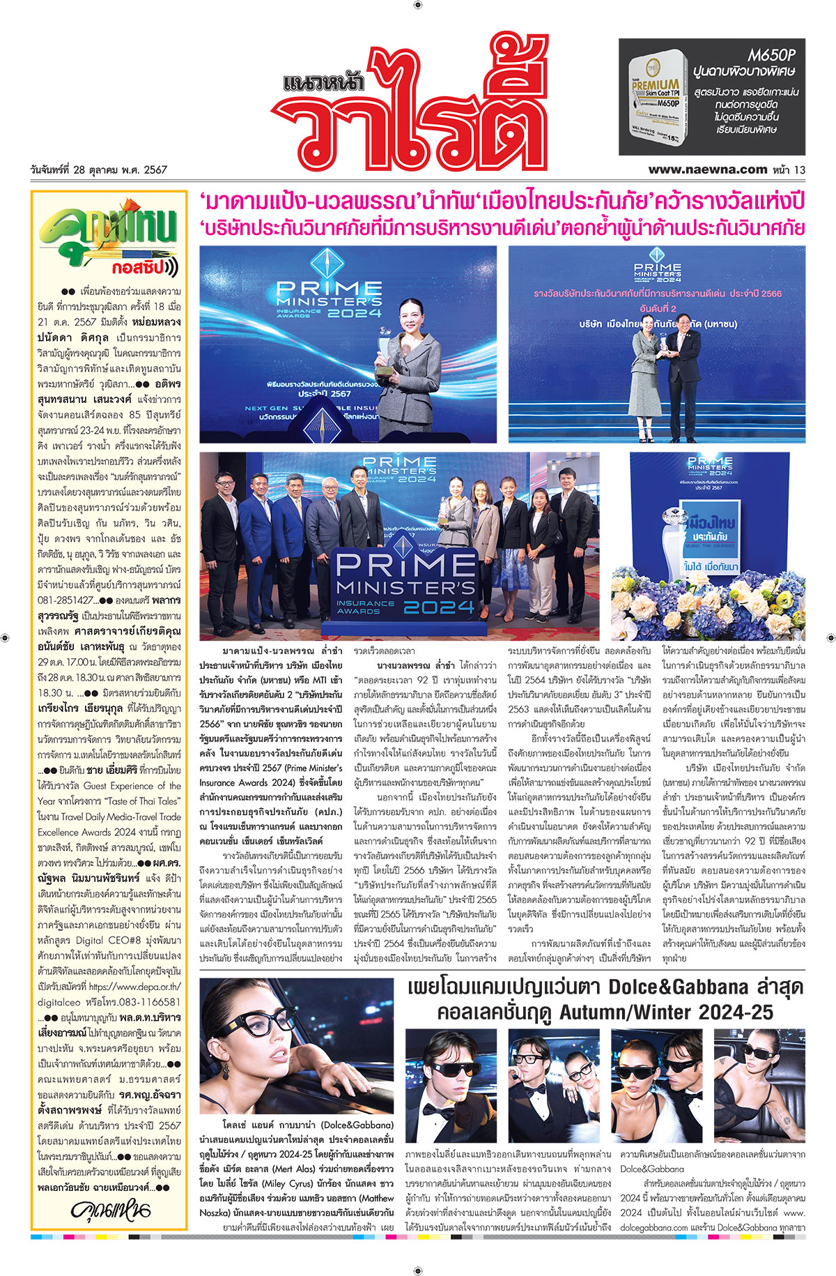 ‘มาดามแป้ง-นวลพรรณ’นำทัพ‘เมืองไทยประกันภัย’คว้ารางวัลแห่งปี ‘บริษัทประกันวินาศภัยที่มีการบริหารงานดีเด่น’ตอกยํ้าผู้นำด้านประกันวินาศภัย
