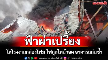 ฟ้าผ่าเปรี้ยง! ใส่โรงงานกล่องโฟม ไฟลุกไหม้วอด อาคารถล่มซ้ำ