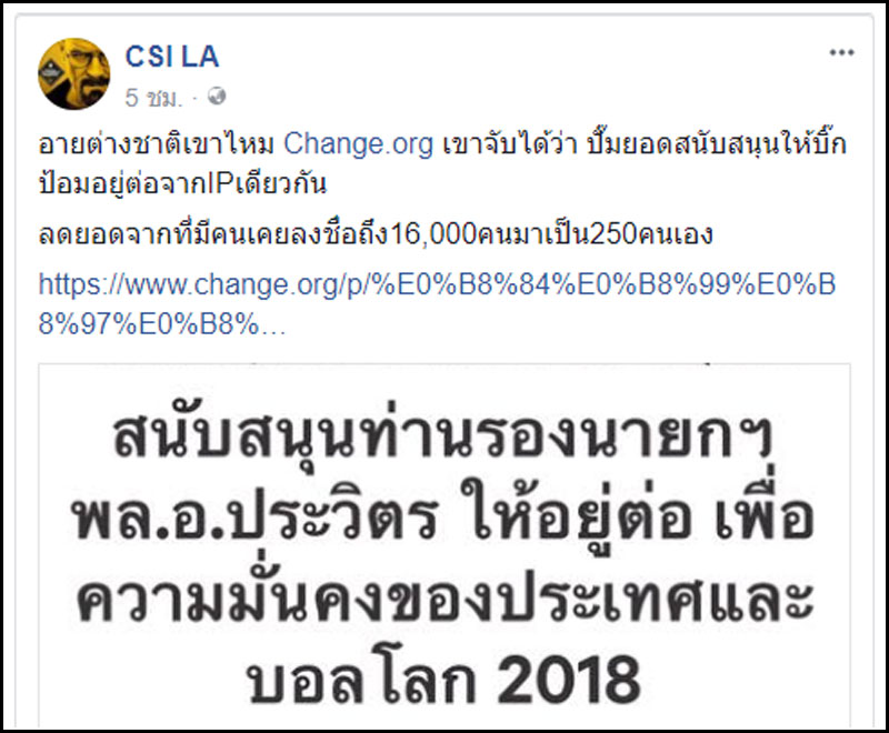 ล่าสุด ในหน้าเพจเฟซบุ๊ก CSI LA ได้โพสต์ข้อความ ระบุว่า "อายต่างชาติเขาไหม Change.org เขาจับได้ว่า ปั๊มยอดสนับสนุนให้บิ๊กป้อมอยู่ต่อจากIPเดียวกัน ลดยอดจากที่มีคนเคยลงชื่อถึง16,000คนมาเป็น250คนเอง"
