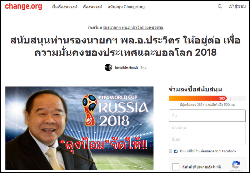 ขณะที่ แคมเปญ "สนับสนุนท่านรองนายกฯ พล.อ.ประวิตร ให้อยู่ต่อ เพื่อความมั่นคงของประเทศและบอลโลก 2018" ในเว็บไซต์ www.change.org ล่าสุด มียอดประชาชนร่วมโหวตอยู่ที่ 363 คนเท่านั้น