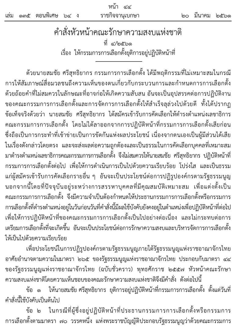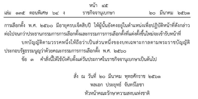 20 มี.ค.61 เว็บไซต์ราชกิจจานุเบกษา เผยแพร่คําสั่งหัวหน้าคณะรักษาความสงบแห่งชาติ ที่ ๔/๒๕๖๑ เรื่อง ให้กรรมการการเลือกตั้งยุติการอยู่ปฏิบัติหน้าที่